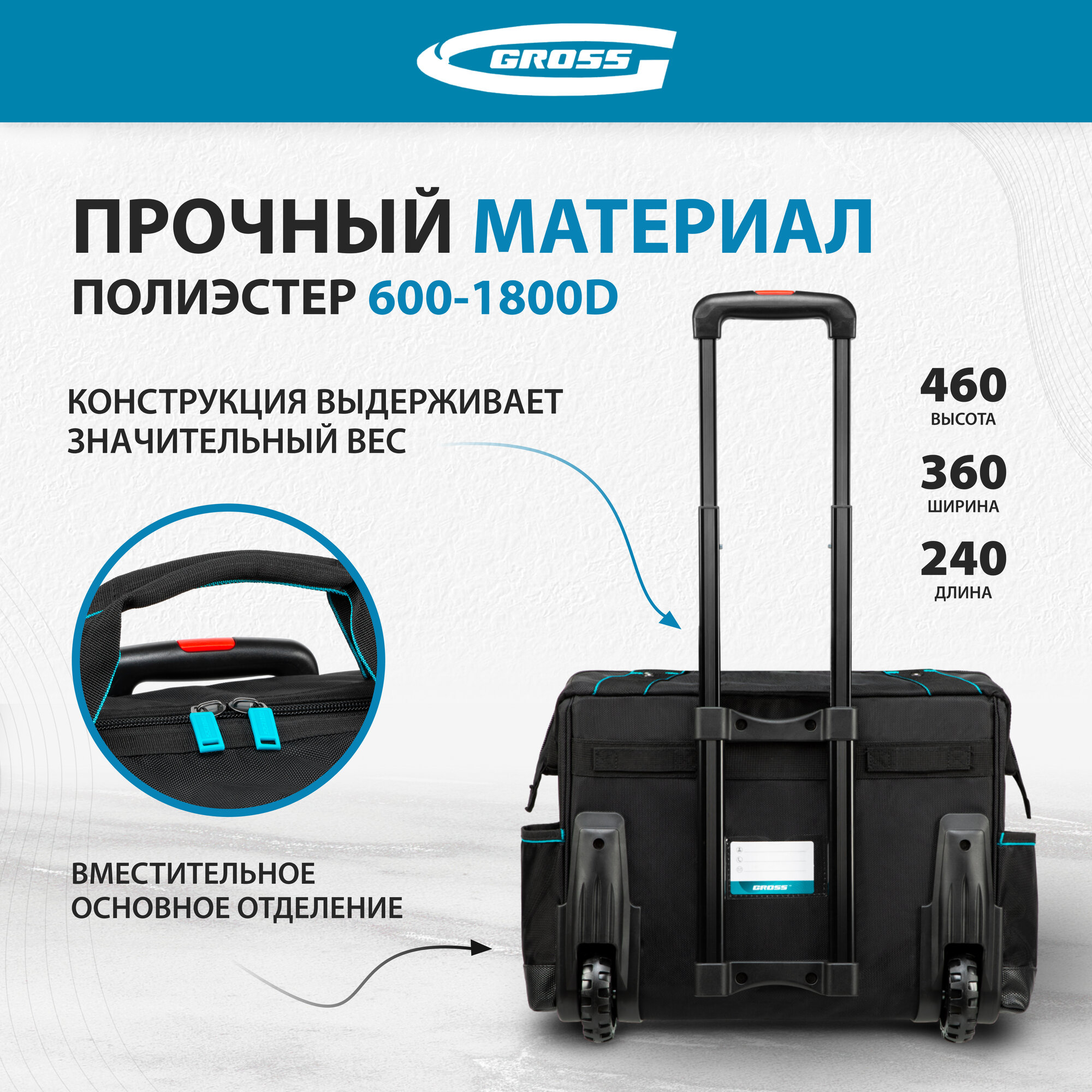 Сумка для инструмента, 460х240х340мм, выдвижная рукоятка, колеса, Gross, 90277