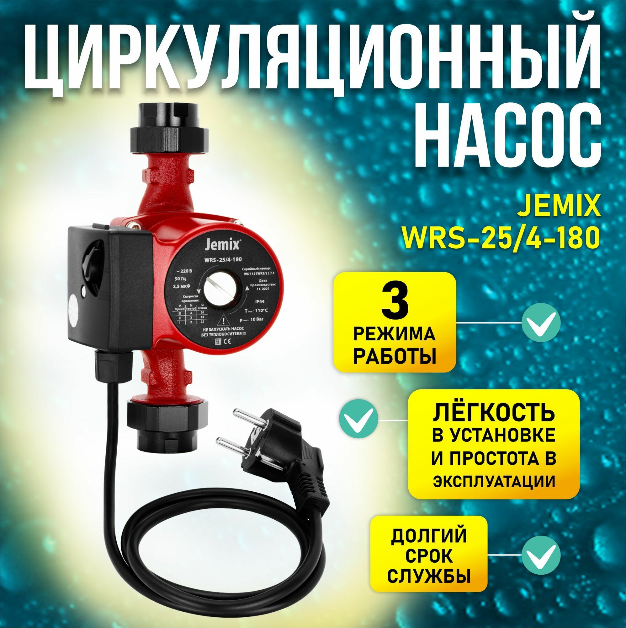 Насос циркуляционный для отопления JEMIX WRS 25/4-180 (70 Вт)для отопления с кабелем