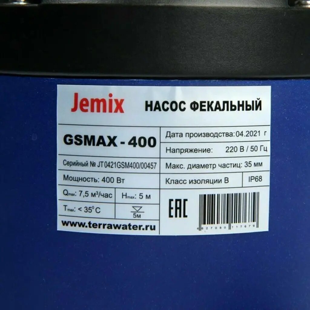 Насос фекальный JEMIX GSMAX-400, 400 Вт, напор 5 м, 125 л/мин, диаметр частиц 35 мм
