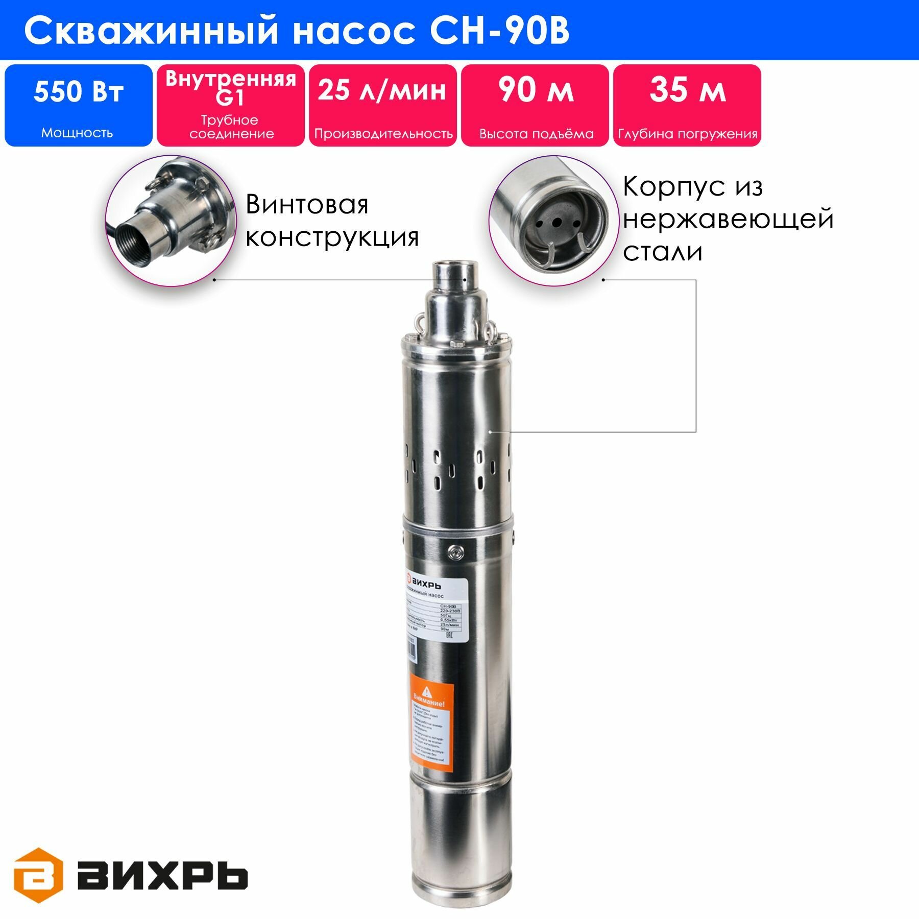 Купить Скважинный насос вихрь СН-90B, 550 Вт, диаметр насоса 90 мм, глубина погружения 35 м, 25 л/мин, 68/3/3