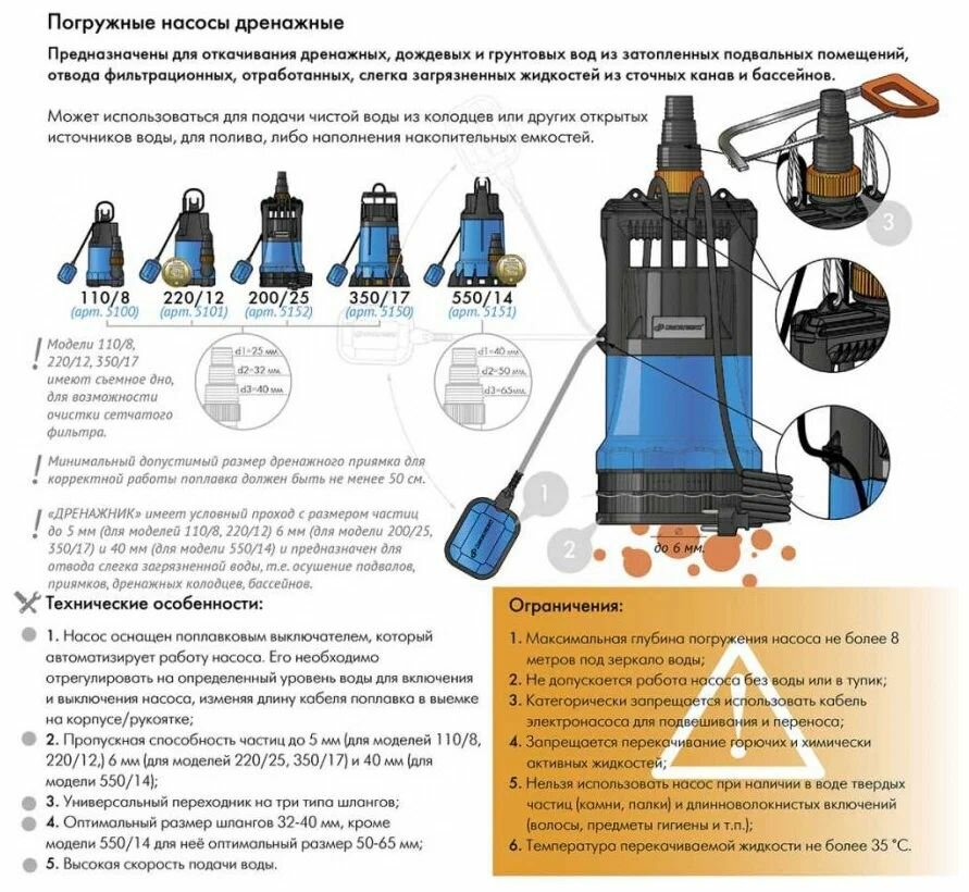| Дополнительная информация | рекомендовано не более 20 включений в час, запрещается погружать, вытаскивать или переносить насос за кабель, максимальный расход: 200 л/мин, степень защиты: x8, максимальное давление: 2.5 бар |