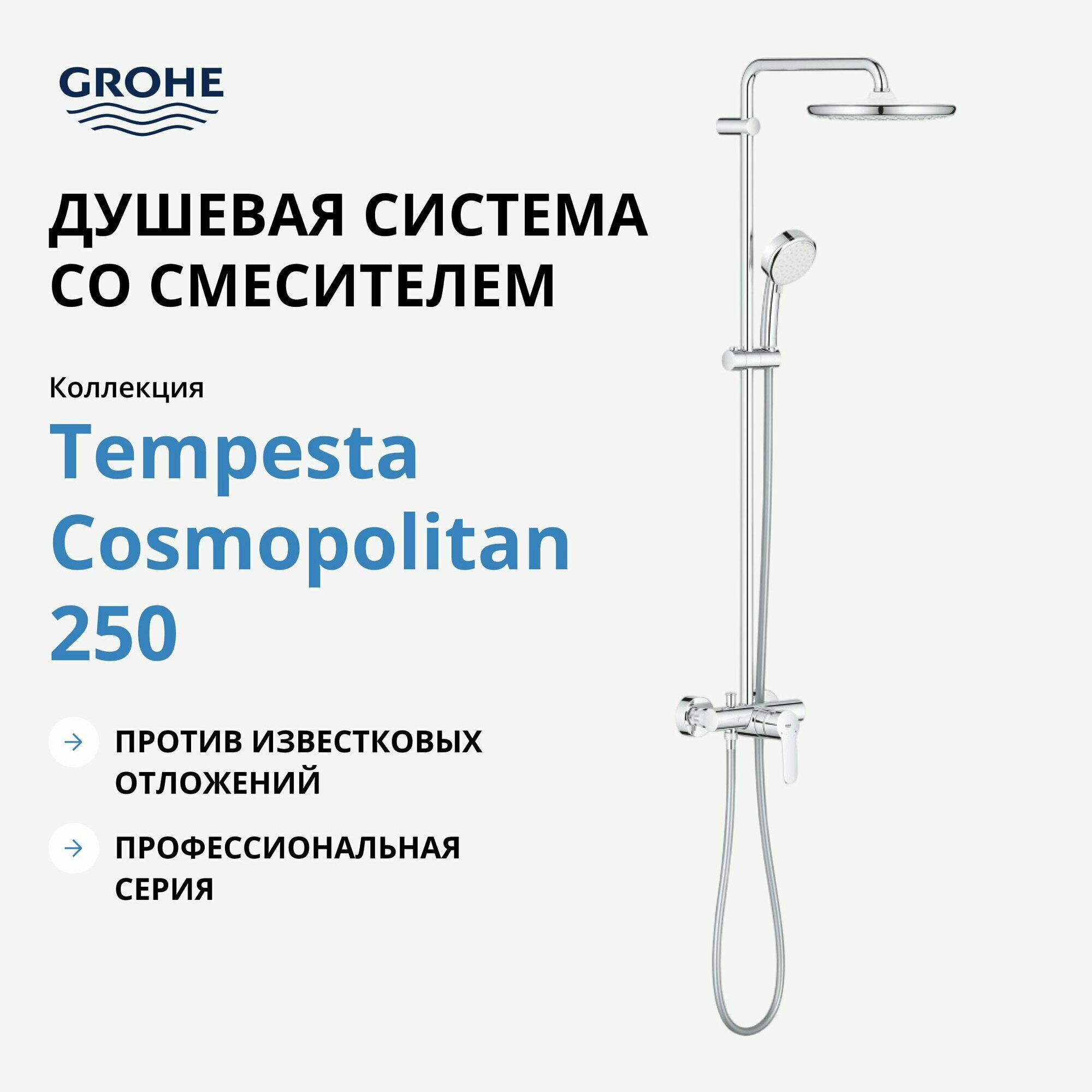 Grohe Душевая система Grohe 26673000 Tempesta Cosmopolitan 250 со смесителем, 1 режим, 9.5 л,мин
