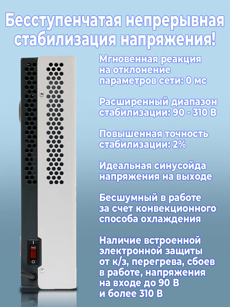 | Минусы: | хлипкая кнопка выключения, её можно выключить не до конца, тогда стабилизатор начинает трещать и показывать перегрузку. Так же при выключении, коло секунды показывает перегрузку и только потом выключается. Хочется узнать у производителя это так и должно быть или этой мой экзепляр?