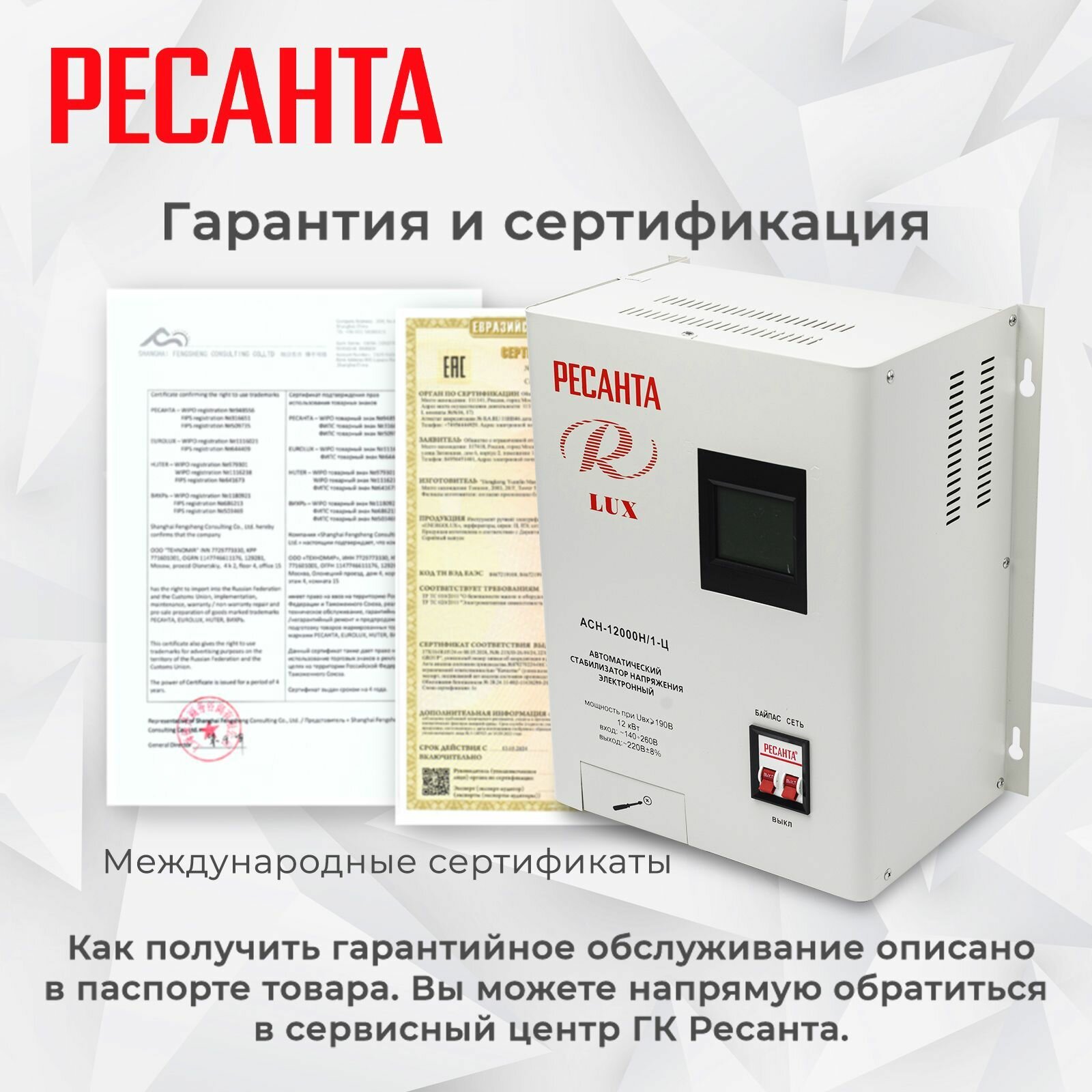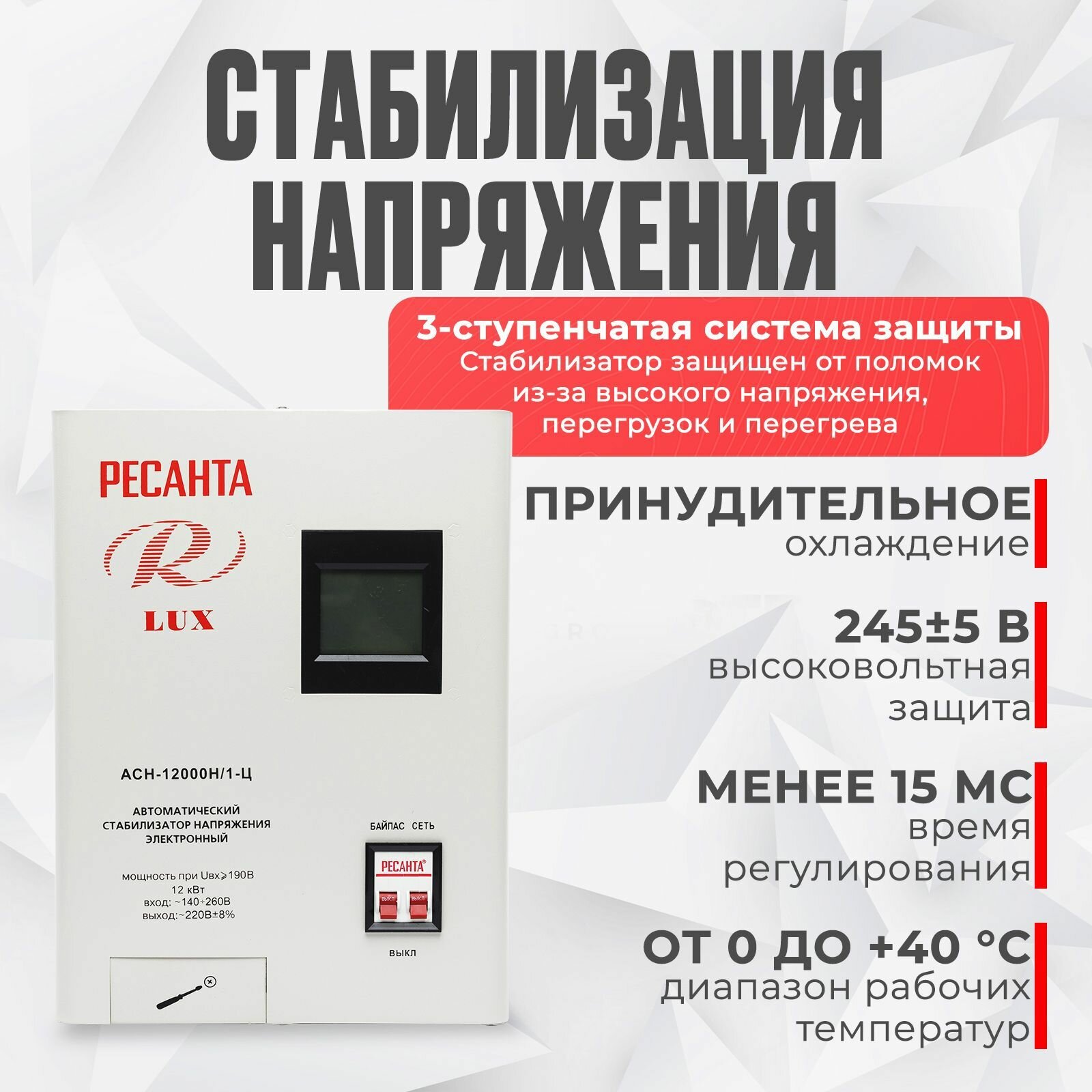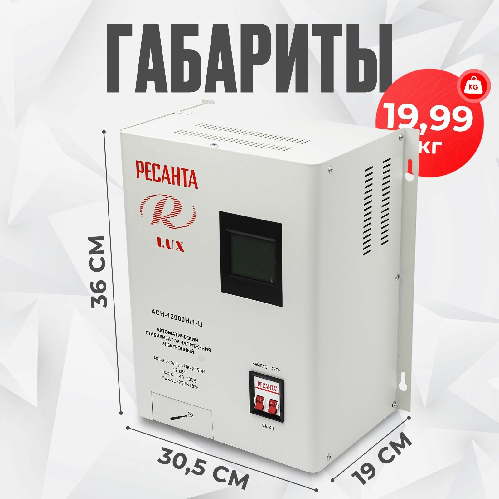 Стабилизатор напряжения серии LUX РЕСАНТА АСН-12000Н/1-Ц, 12 кВт, настенный