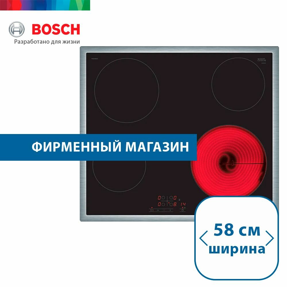 Электрическая варочная панель BOSCH PKE645BB2E, с рамкой, цвет панели черный, Германия