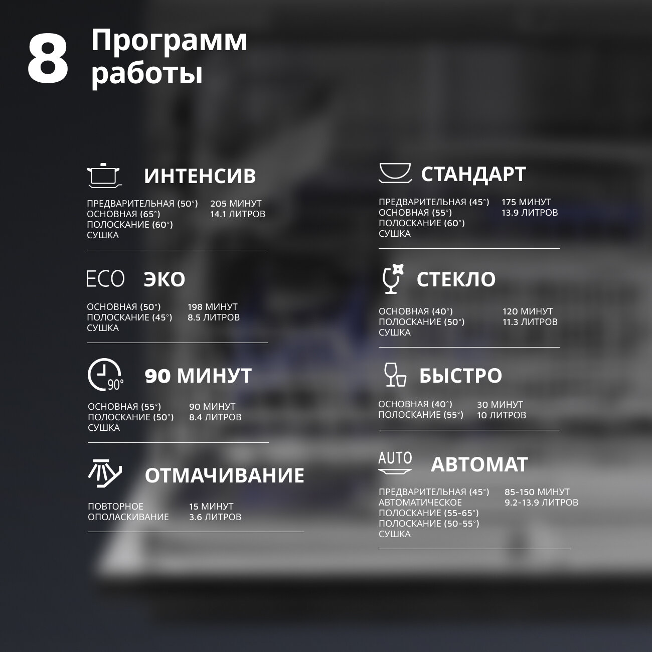 | Плюсы: | Тихая, три корзины с регулировкой по высоте и складывающимися "гребенками". Есть короткий режим 30 минут, есть супер короткое ополаскивание 15 мин. |