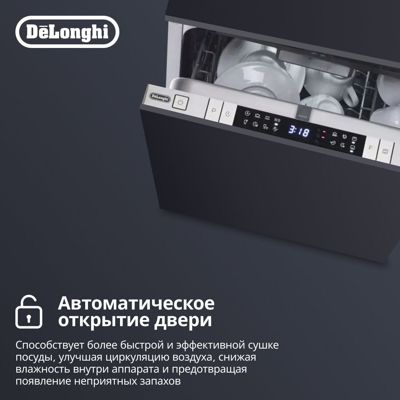 Встраиваемая посудомоечная машина DeLonghi DDWI 490 AMEDEO, 45 см, 10 комплектов, 3 корзины, автооткрытие двери, турбосушка, сенсор мутности AquaSensor, луч на полу