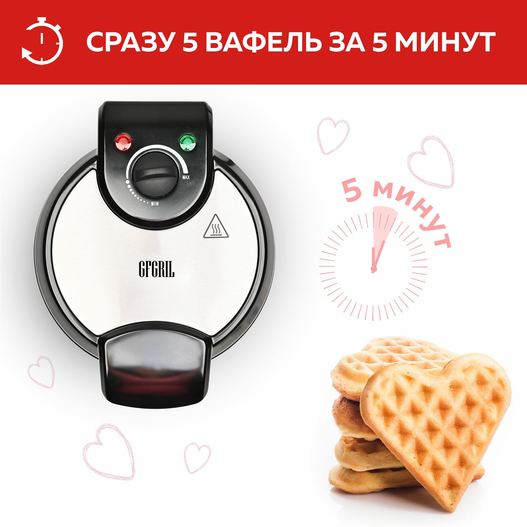 GFGRIL Электровафельница GFW-028 "5 сердечек" для венских и бельгийских вафель, электрическая вафельница с антипригарным покрытием, 5 вафель, регулятор температуры