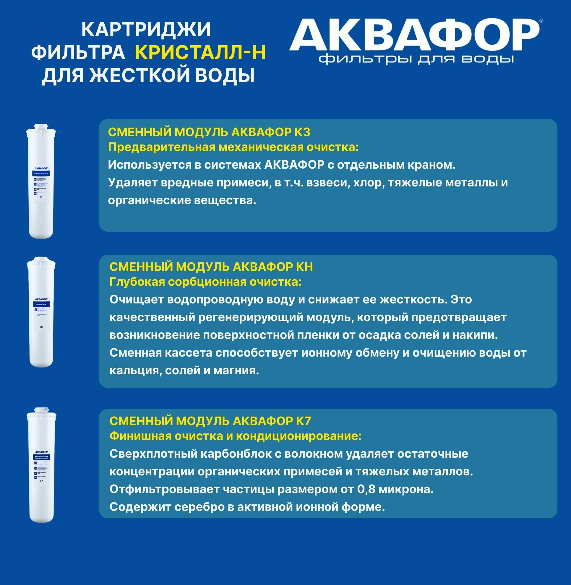 Фильтр для воды Аквафор Кристалл Н с модулями К3-КН-К7 (для жесткой воды), умягчающий, от накипи, с отдельным краном.