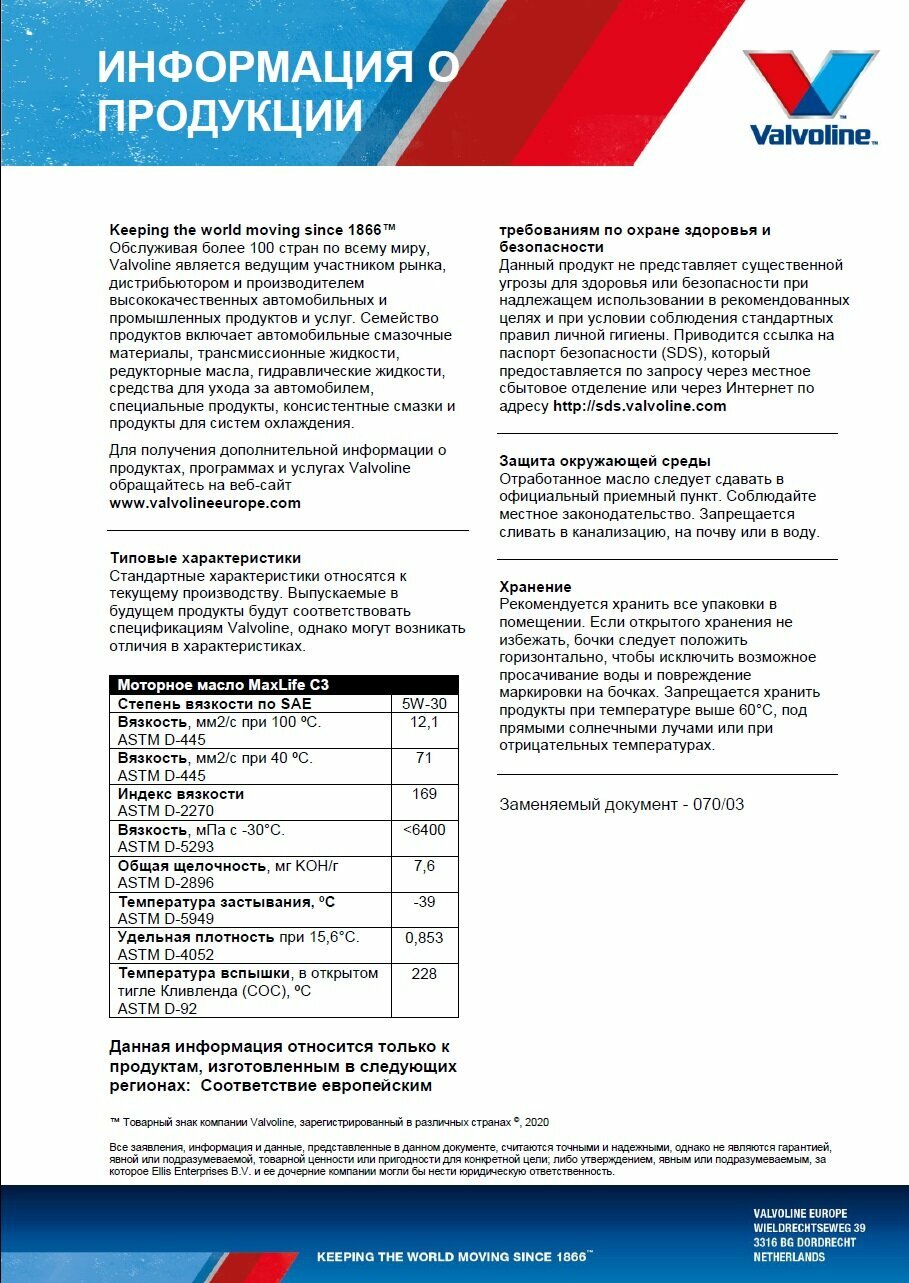 Синтетическое моторное масло VALVOLINE MaxLife C3 5W-30, 5 л, 5 кг, 1 шт