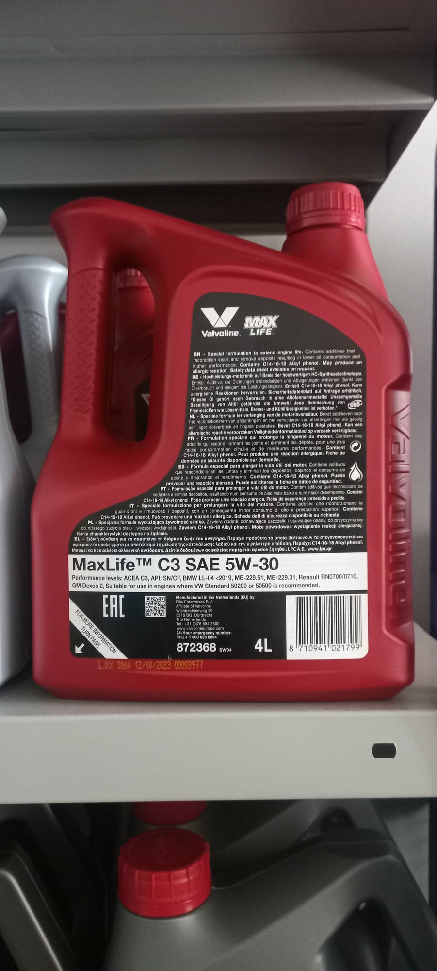 Синтетическое моторное масло VALVOLINE MaxLife C3 5W-30, 4 л, 3.8 кг, 1 шт