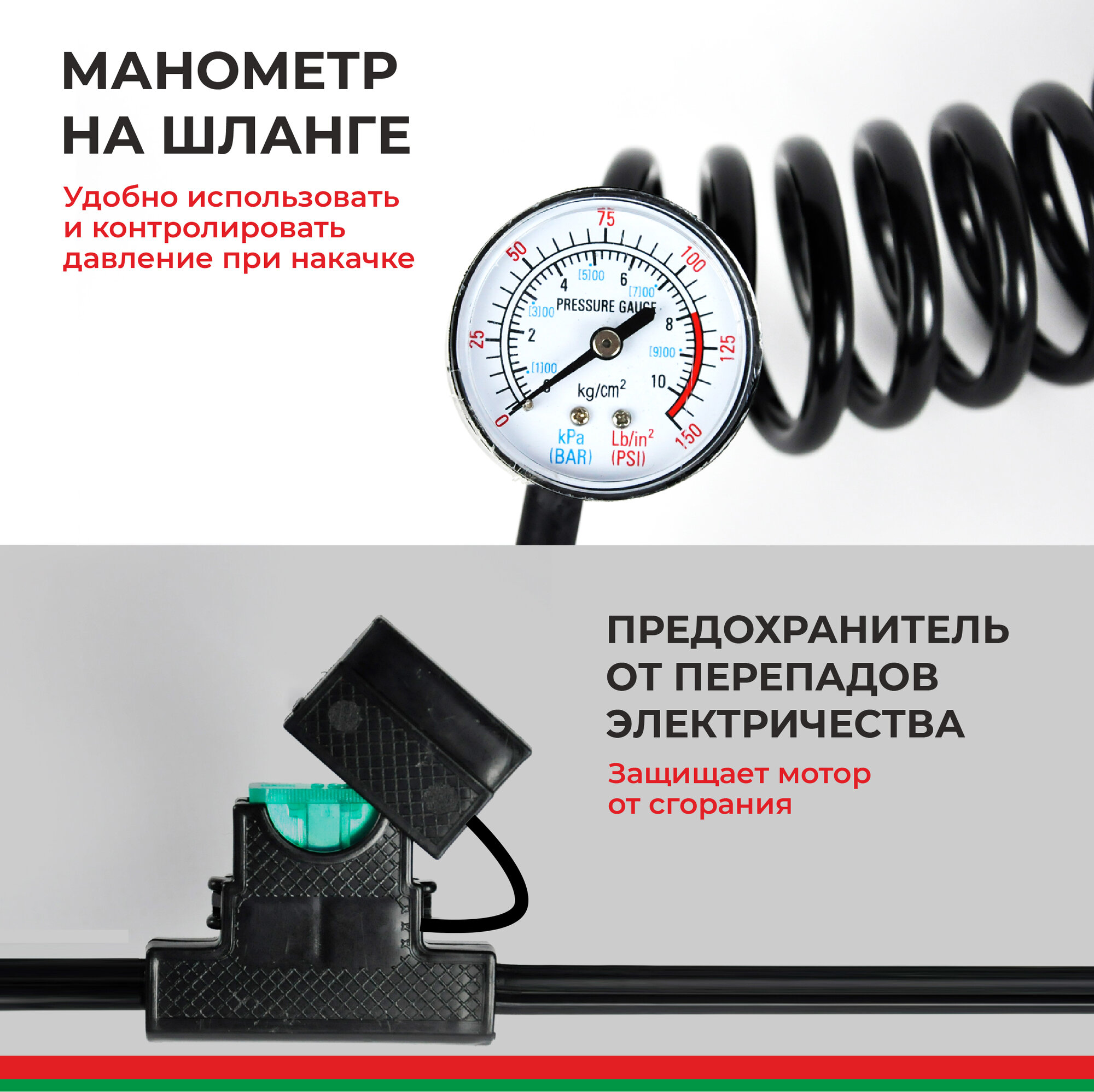 | Плюсы: | Все качественно исполнено, качает быстро. Первый запуск делайте на холостых, не подключая шланг к баллону покрышки под давлением, у меня не запустился под нагрузкой. Как отцепил шланг, сразу стал качать. |