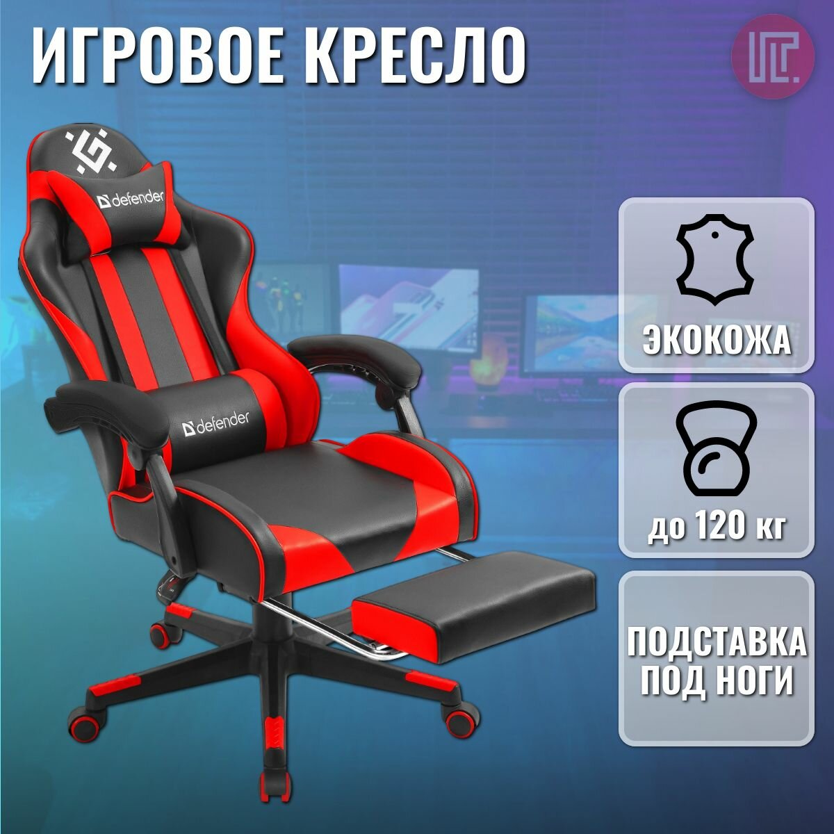 Компьютерное игровое кресло Defender Rock из эко-кожи с регулировкой высоты и подставкой для ног, на металлической раме, 2 подушки.