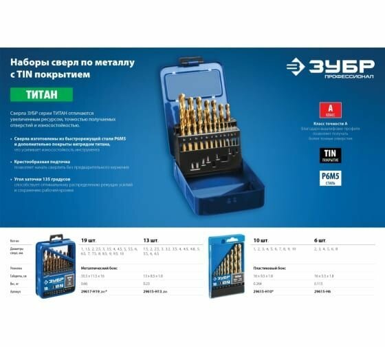 ЗУБР титан 13шт(1.5-6.5мм), Набор сверл по металлу, сталь Р6М5, класс А, титиновое покрытие, 29615-H13, Серия Профессионал