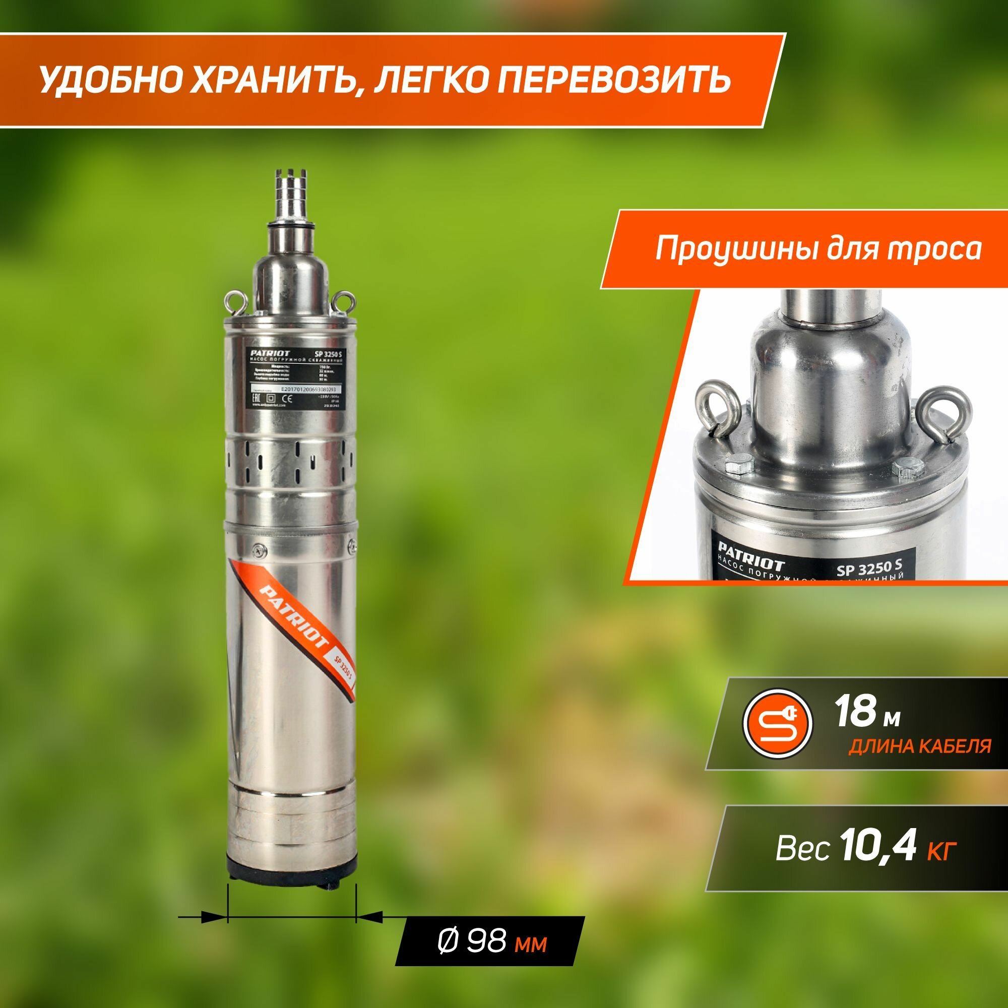 Насос скважинный PATRIOT SP 3250 S, винтовой тип, 750 Вт,1920 л/час, подъем - 80 м, кабель 18 м, шт PATRIOT