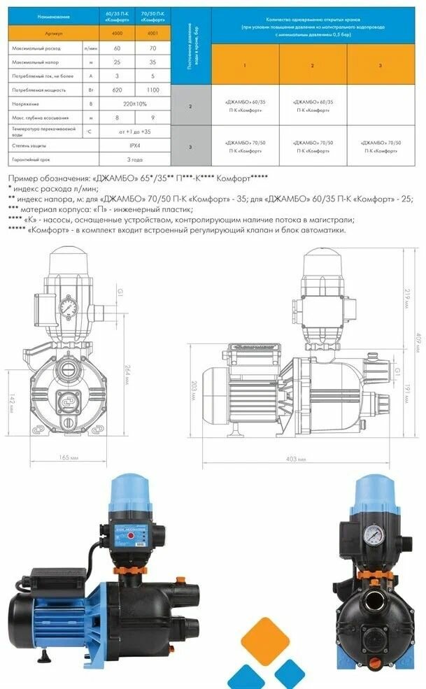 | Функции | повышение давления / плавный пуск двигателя / защита от сухого хода / защита от перегрева |