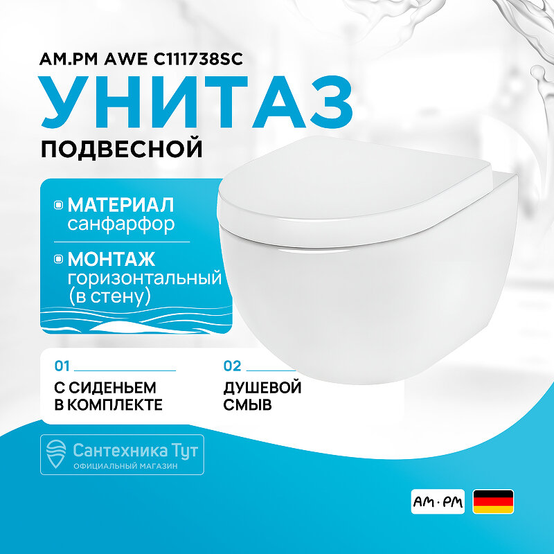 СохранитьУнитаз подвесной AM.PM Awe душевой смыв, быстросъемное сиденье с микролифтом из дюропласта, антивсплеск интересное: