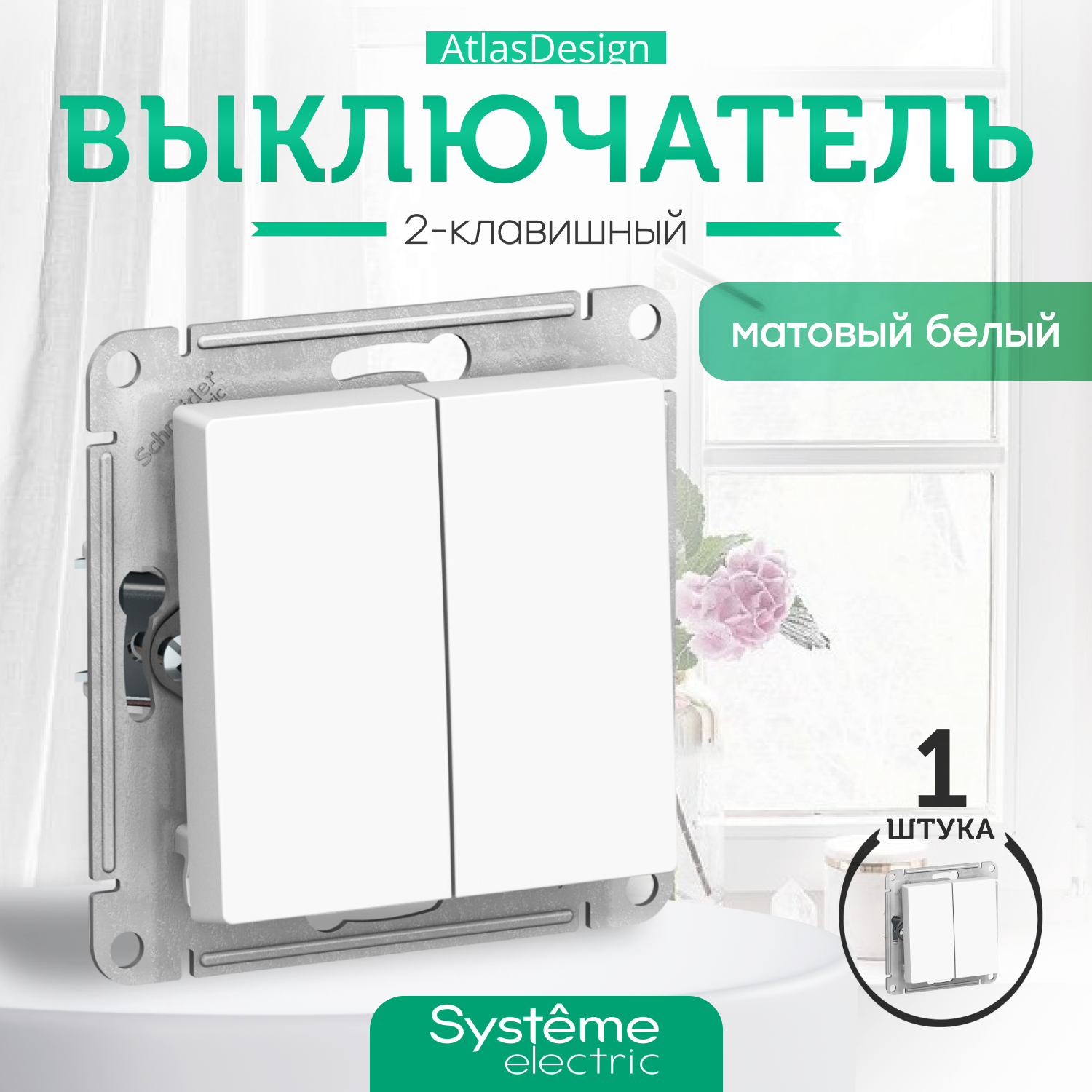 1 шт. Systeme Electric AtlasDesign Изумруд Выключатель 2-клавишный с самовозвратом, сх.2, 10А, механизм, ATN000817