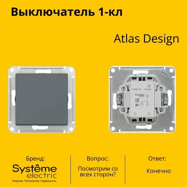 СохранитьВыключатель электрический Systeme Electric Atlas Design 1-клавишный, 10А, 10 AX, Грифель ATN000711 - 1 шт. интересное: