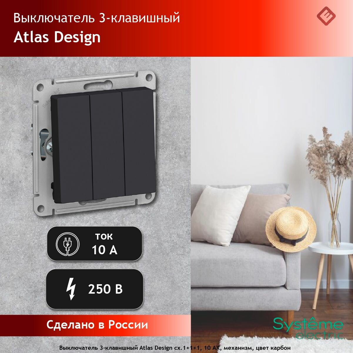 СохранитьSE AtlasDesign Карбон Выключатель 3-кл. сх.1+1+1, 10АХ, механизм интересное: