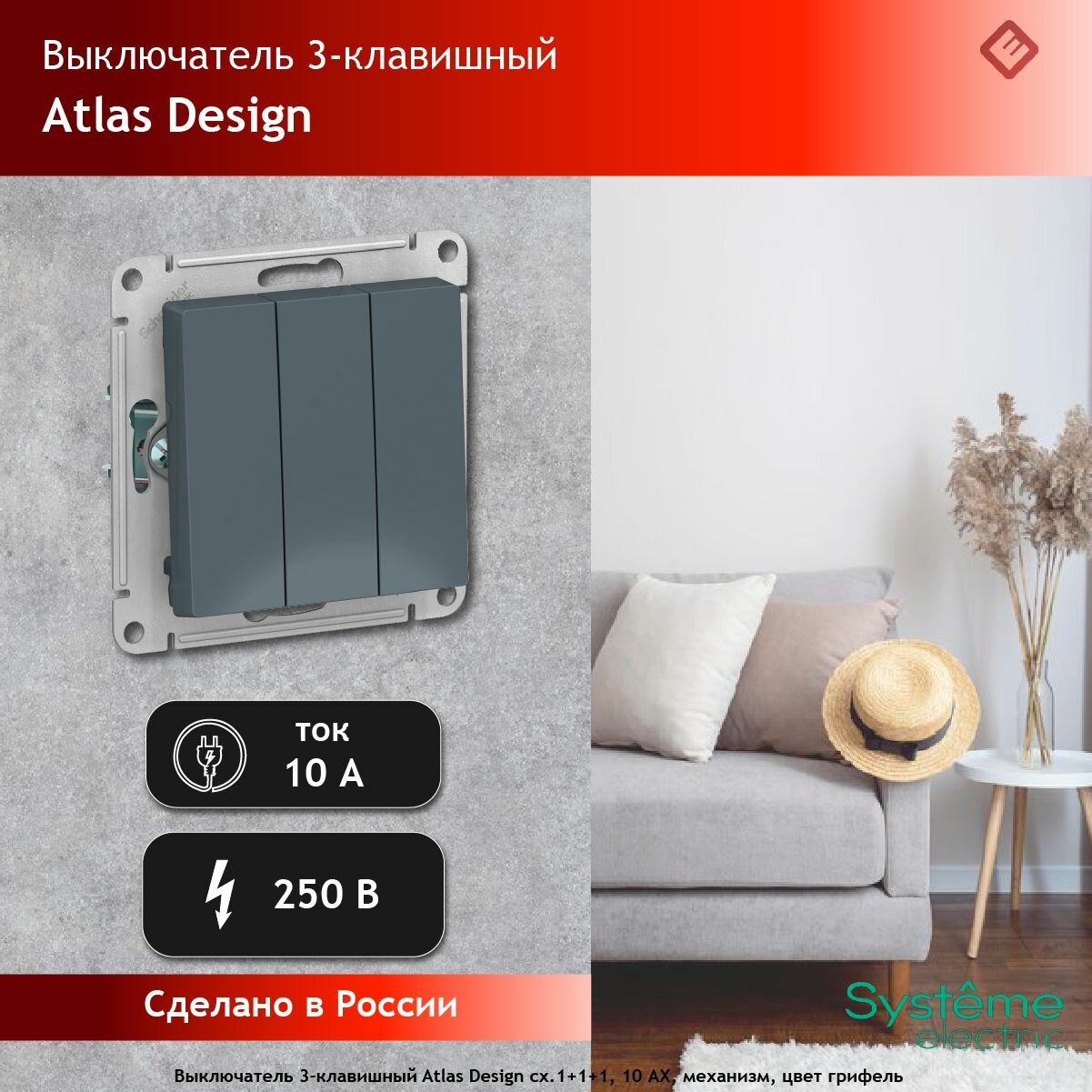 Купить Выключатель трехклавишный сх.1+1+1, 10АХ, механизм Грифель, Schneider Electric AtlasDesign (комплект 4шт)