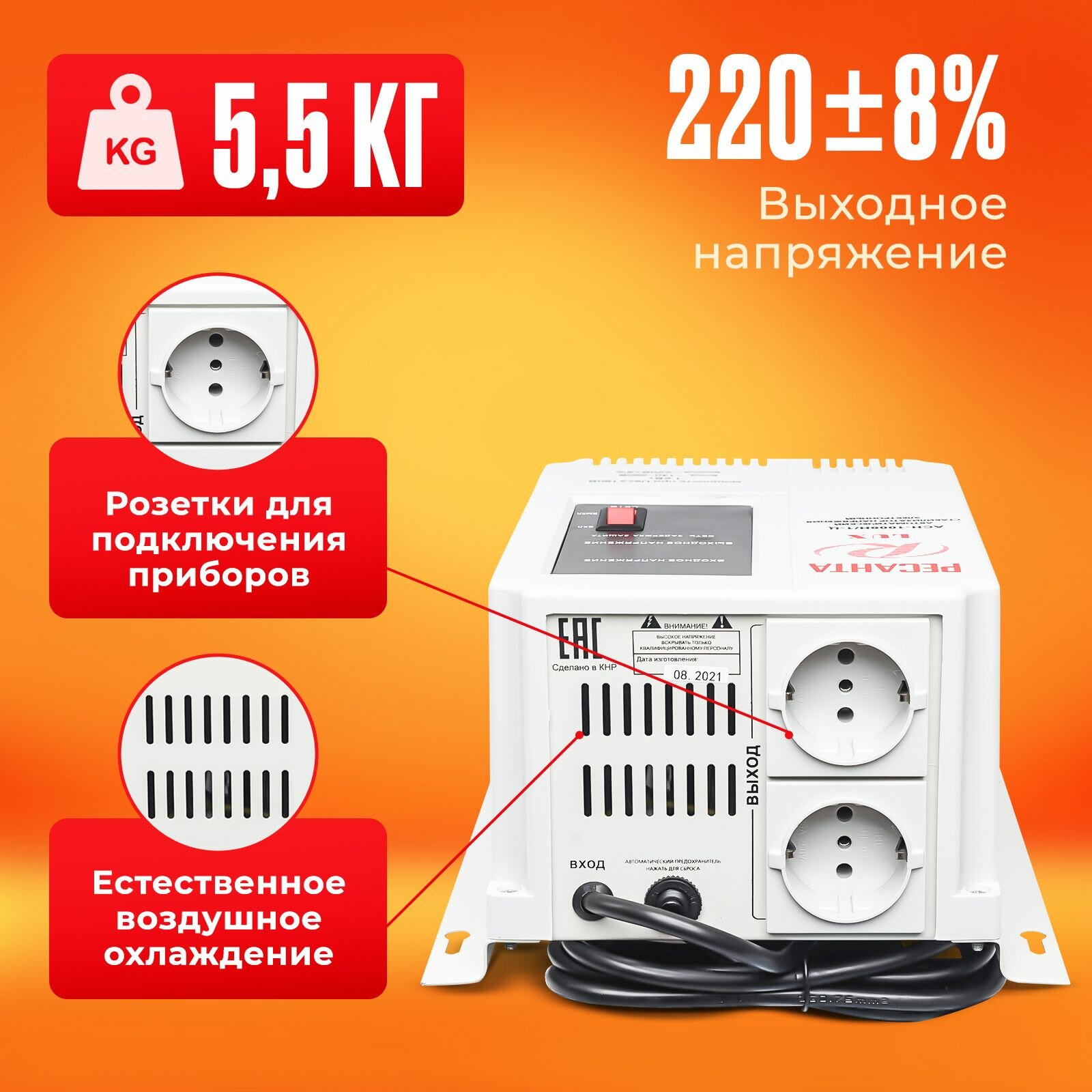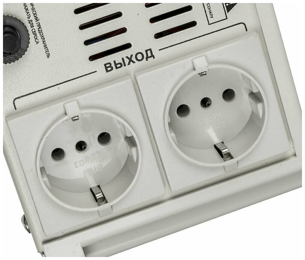| Дополнительная информация | мин. выходное напряжение (фазное): 202 В; макс. входное напряжение (рабочее): 260 В; скорость стабилизации: 35 В/с; макс. входная частота: 60 Гц; мин. входная частота: 50 Гц; количество выходных розеток (общее): 2 шт. |