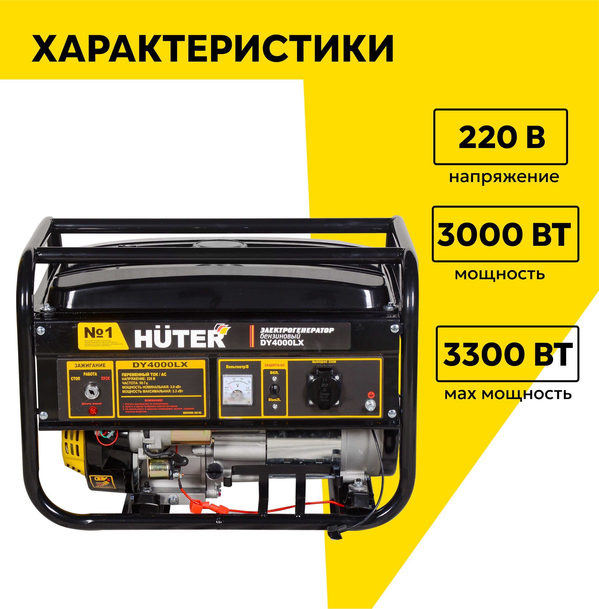 Бензиновый генератор HUTER DY4000LX с электростартером и максимальной мощностью 3300 Вт