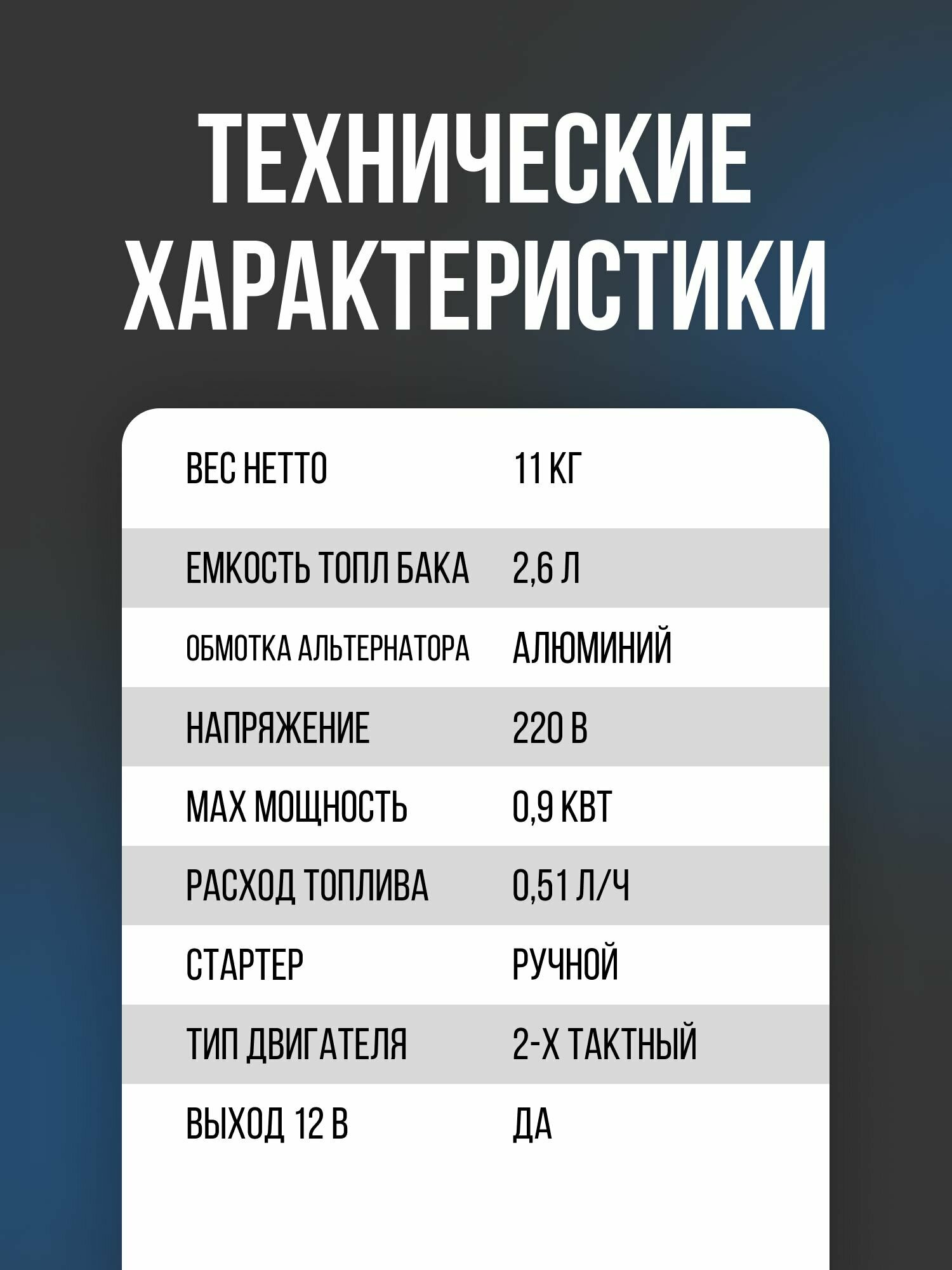 | Дополнительная информация | комплектация: свечной ключ, провода для выхода 12В, вилка 16А, комбинированная отвертка, инструкция |