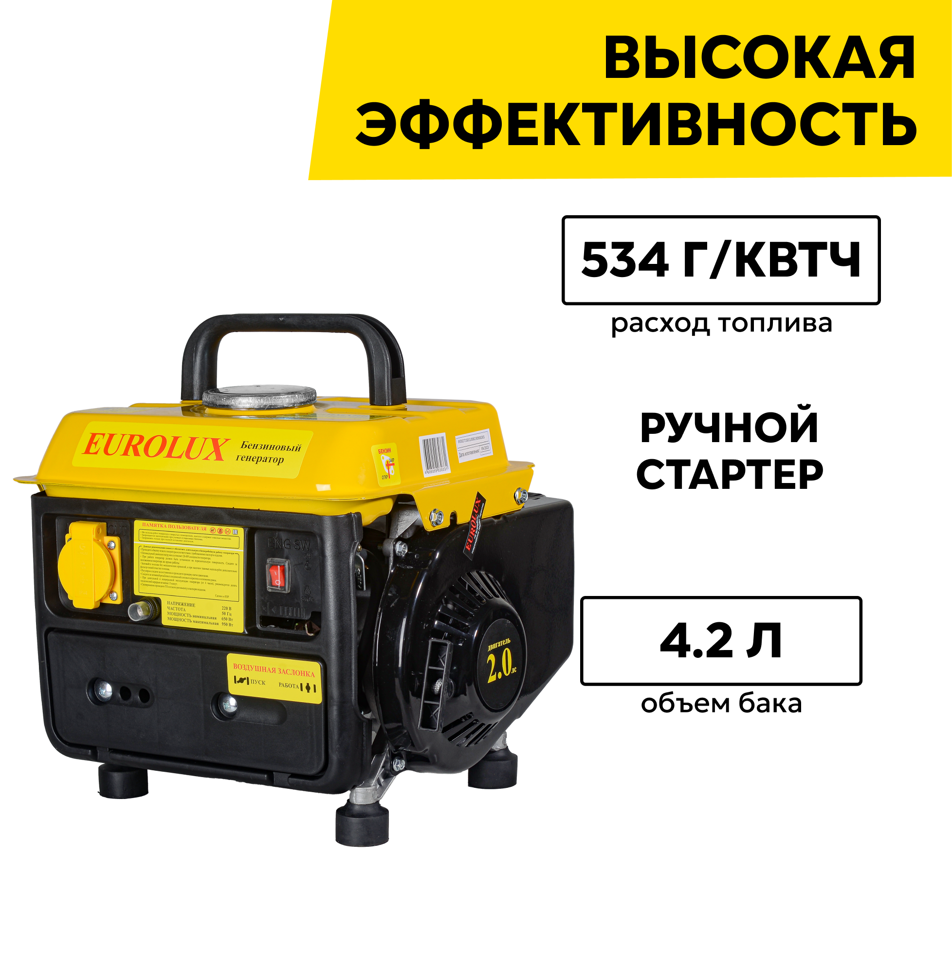 Генератор бензиновый EUROLUX G950A , максимальная мощность 950 Вт, с ручным стартером интересное: