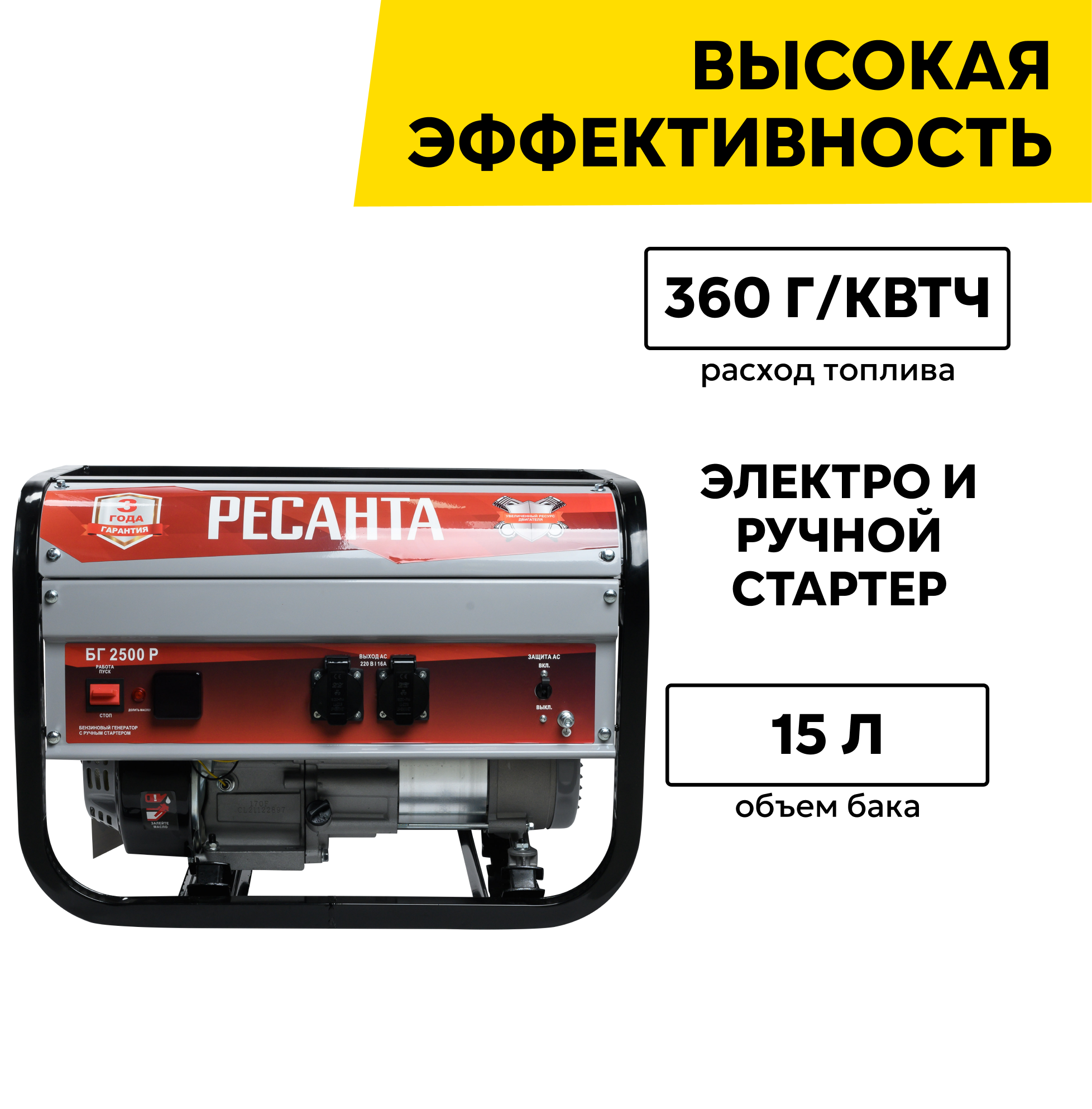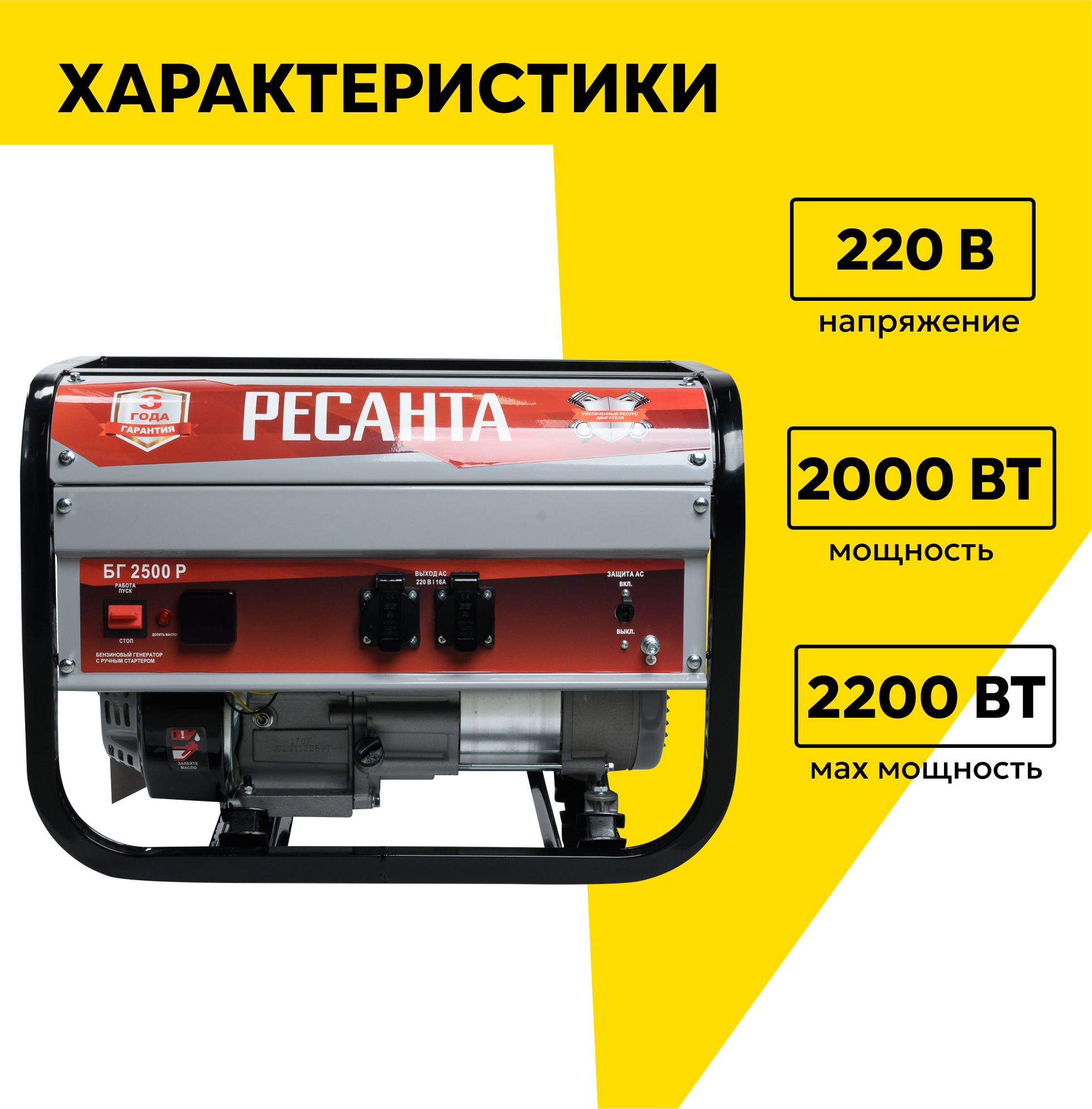 Генератор бензиновый БГ 2500 Р Ресанта с ручным стартером, максимальная мощность 2200 Вт