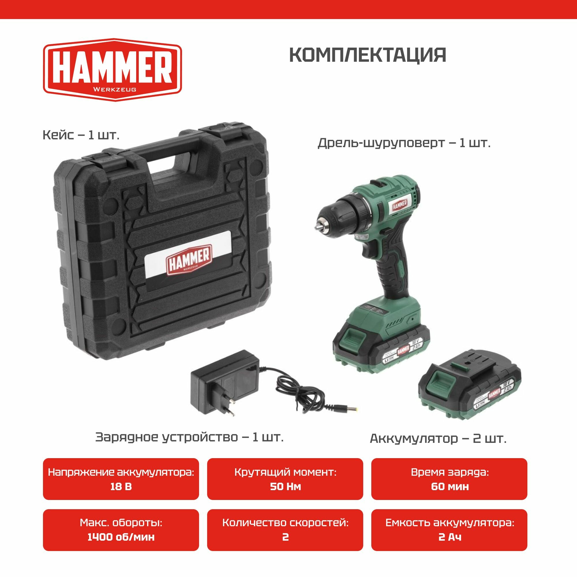 Купить Шуруповерт аккумуляторный HAMMER ACD18BL, в кейсе, 2 акк. Li-ion, 18В, 50 Нм