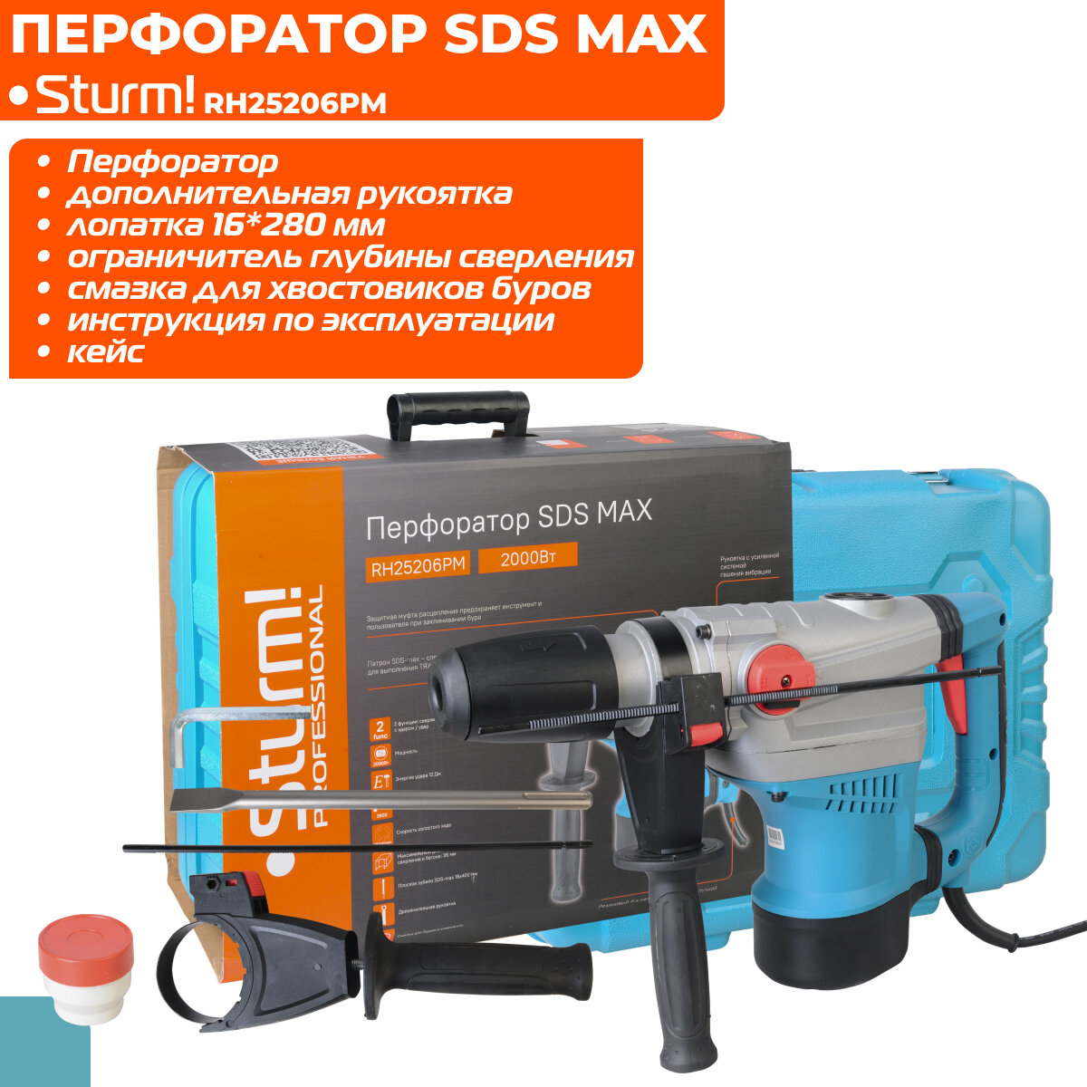 RH25206PM Перфоратор SDS-MAX 2000Вт, 12Дж, 3900уд/мин, 560об/мин, 2 режима, кейс, Sturm!