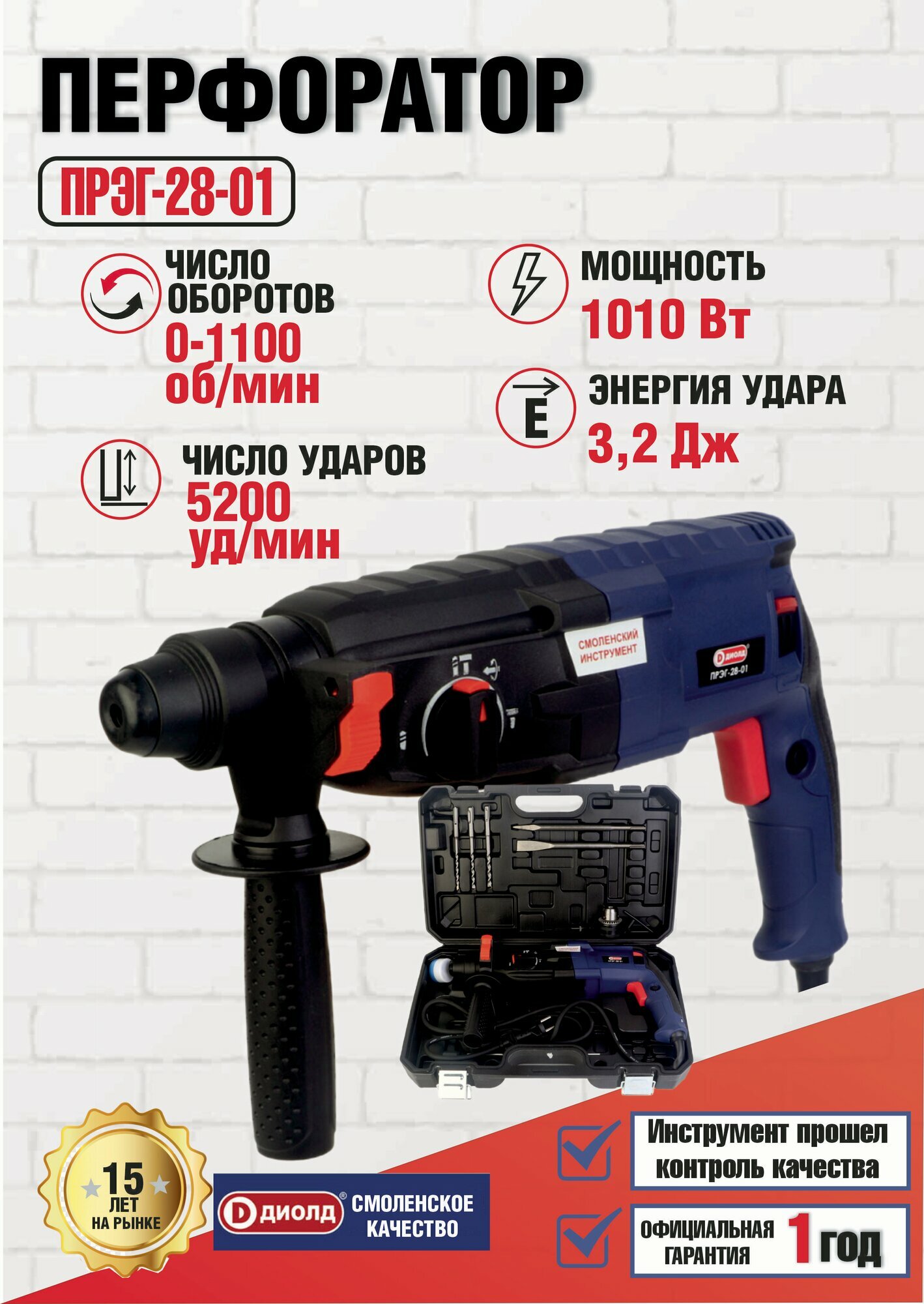 Перфоратор ударный диолд ПРЭГ-28-01 в кейсе / регулировка оборотов 0-1100об/мин, 1010 Вт, 5200уд/мин, 3,2 Дж, 3 режима, SDS+, производитель Россия
