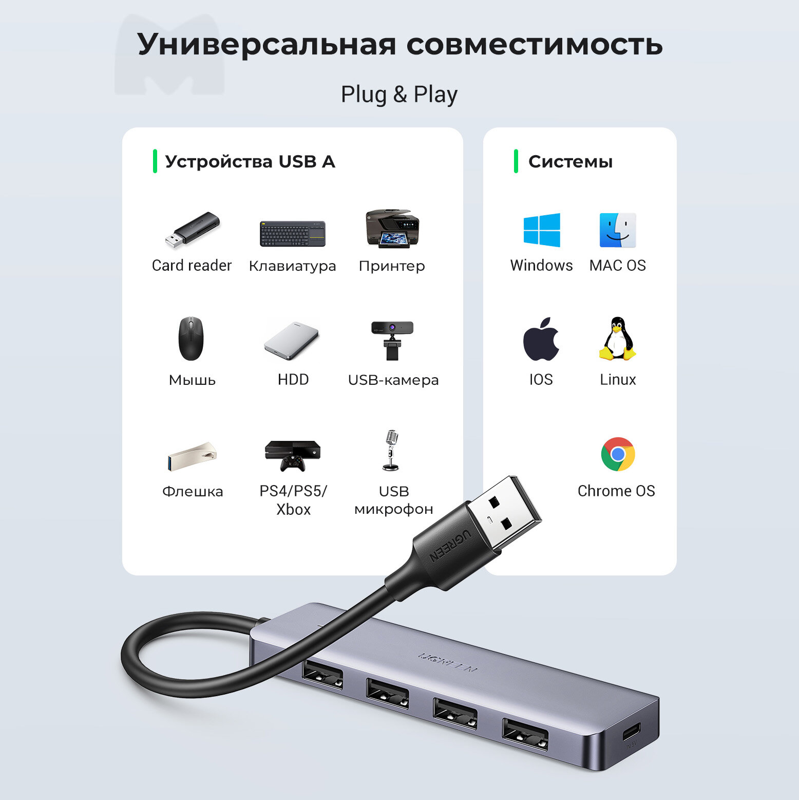 СохранитьUSB-хаб UGREEN CM219 USB 3.0 Type-A (4xUSB 3.0 Type-A) Серый 50985_ интересное: