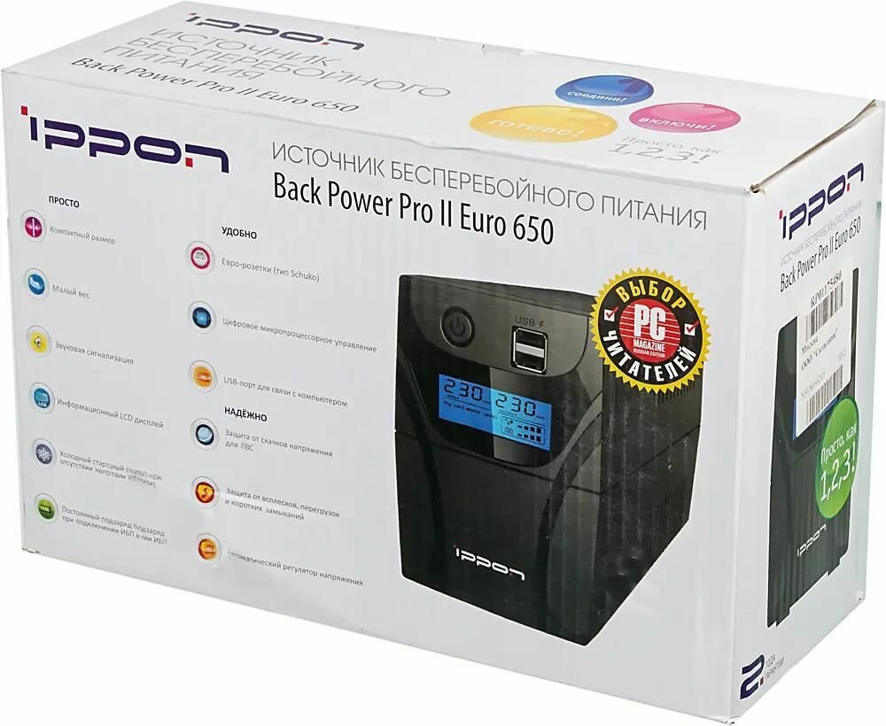 ИБП Ippon Back Power Pro II 650 650VA/360W LCD,RJ-45,USB (2 EURO)