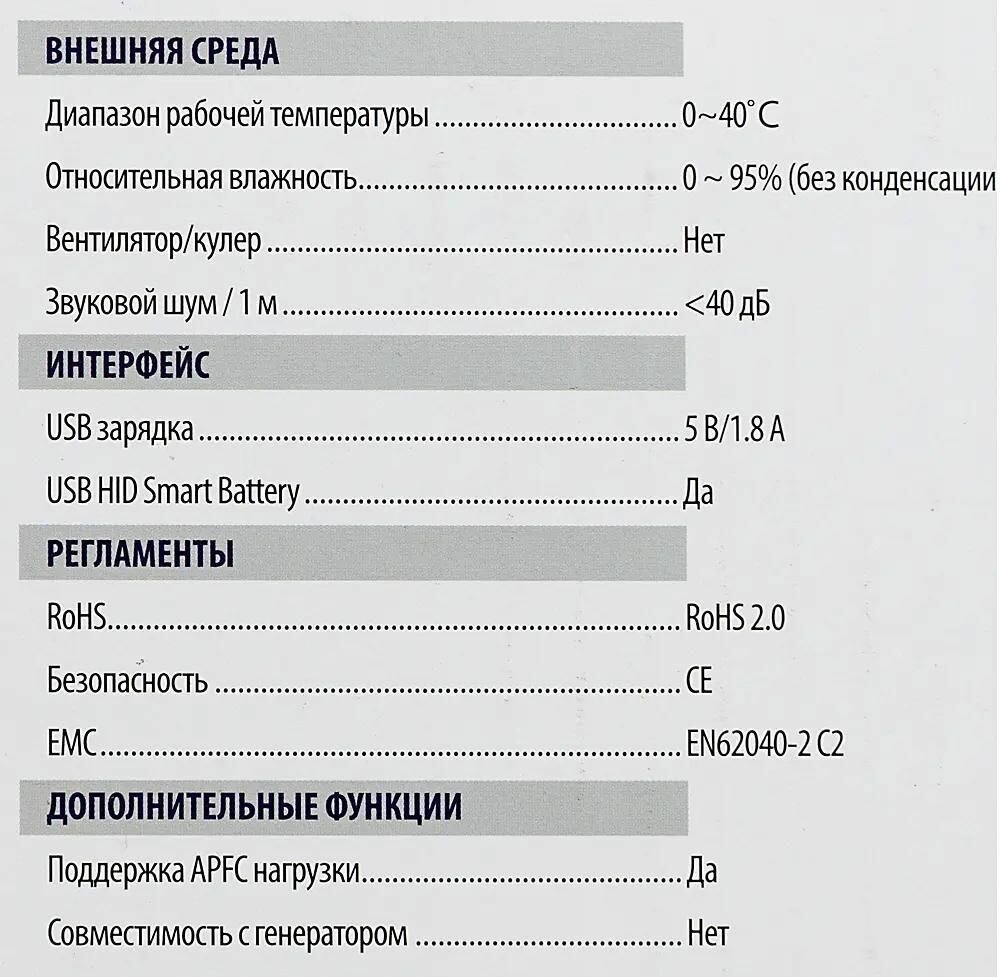 | Отзыв: | Звук неисправностей, перехода на АКБ и низкого заряда громкий, пропустить невозможно. Корпус охлаждается и за перегрев можно не переживать. |