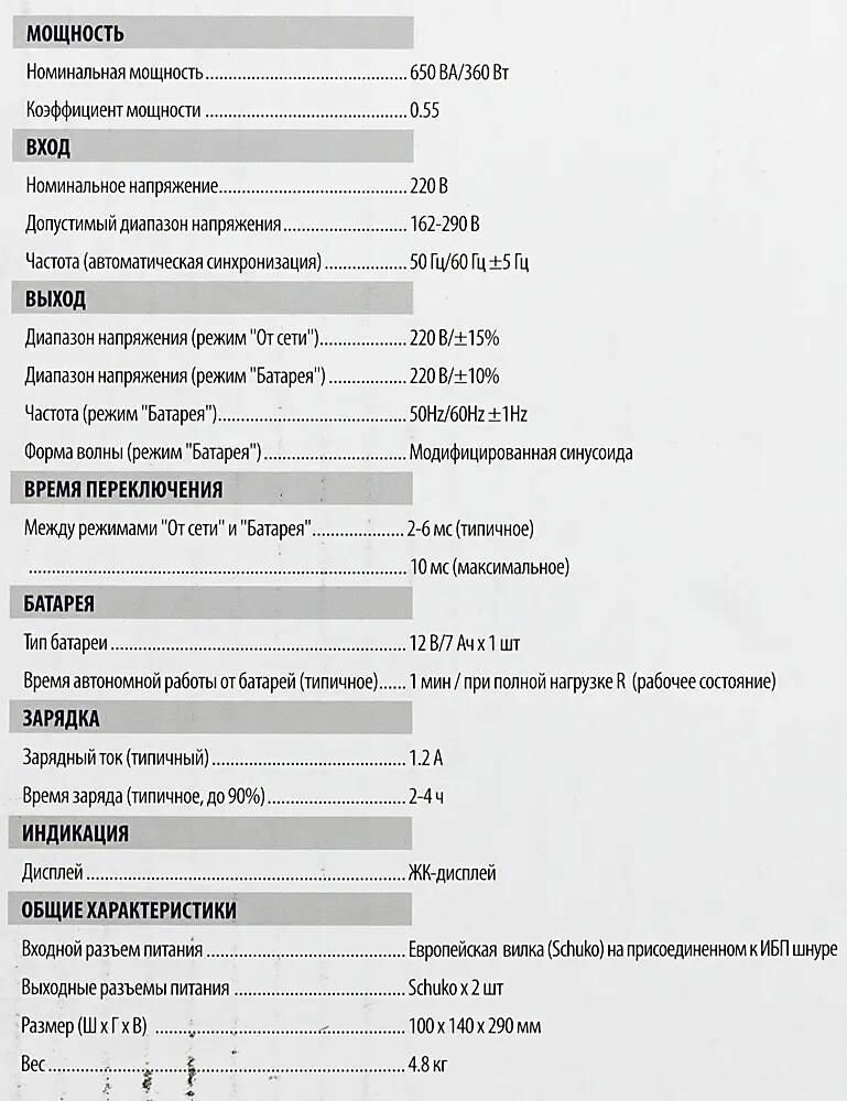 | Выходная мощность (полная) | 650 ВА |