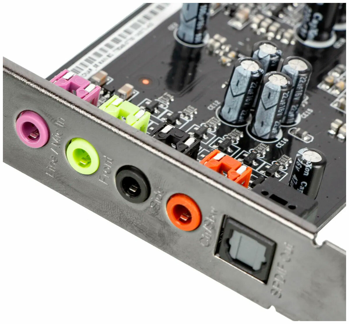 Чип на самом деле 7.1, карточка имеет 5.1 только благодаря уловкам маркетологов. Расстояния между гнездами очень маленькое, пришлось подрезать бок толстого штекера от колонок чтоб воткнуть рядом со штекером микрофона. Гнездо микрофона очень тугое, есть шанс выломать, если часто пользоваться, думаю, это проблема только моей карточки. |