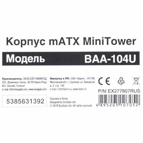Корпус ExeGate BAA-104U mATX, Mini-Tower, Без БП черный (EX277807RUS)
