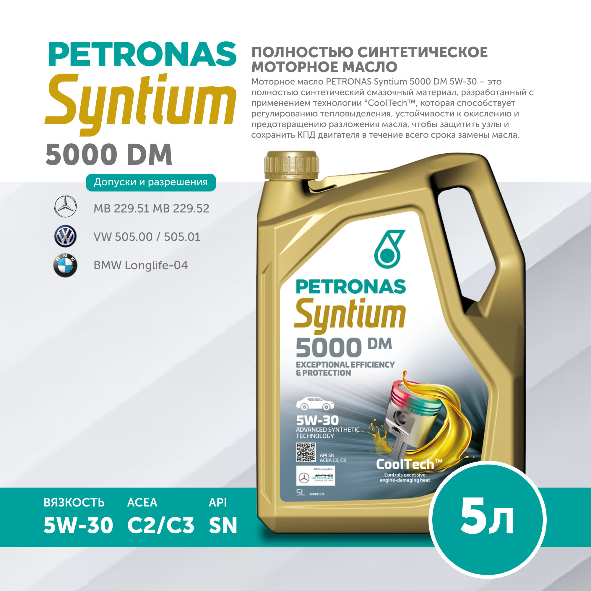 Купить Моторное масло PETRONAS SYNTIUM 5000 DM 5W-30 Синтетическое 5л MB-Approval 229.51, MB-Approval 229.52, VW 505.00 / 505.01, BMW Longlife-04, API SN, ACEA C2 C3, 70644M12EU