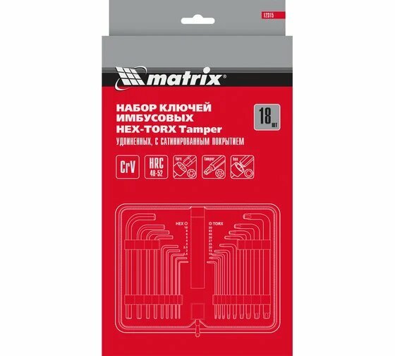 Набор ключей Matrix 12315, HEX-TORX, 18 шт: HEX 1,5-10 мм, T10-T50, CrV, удлиненных, с сатиновым покрытием