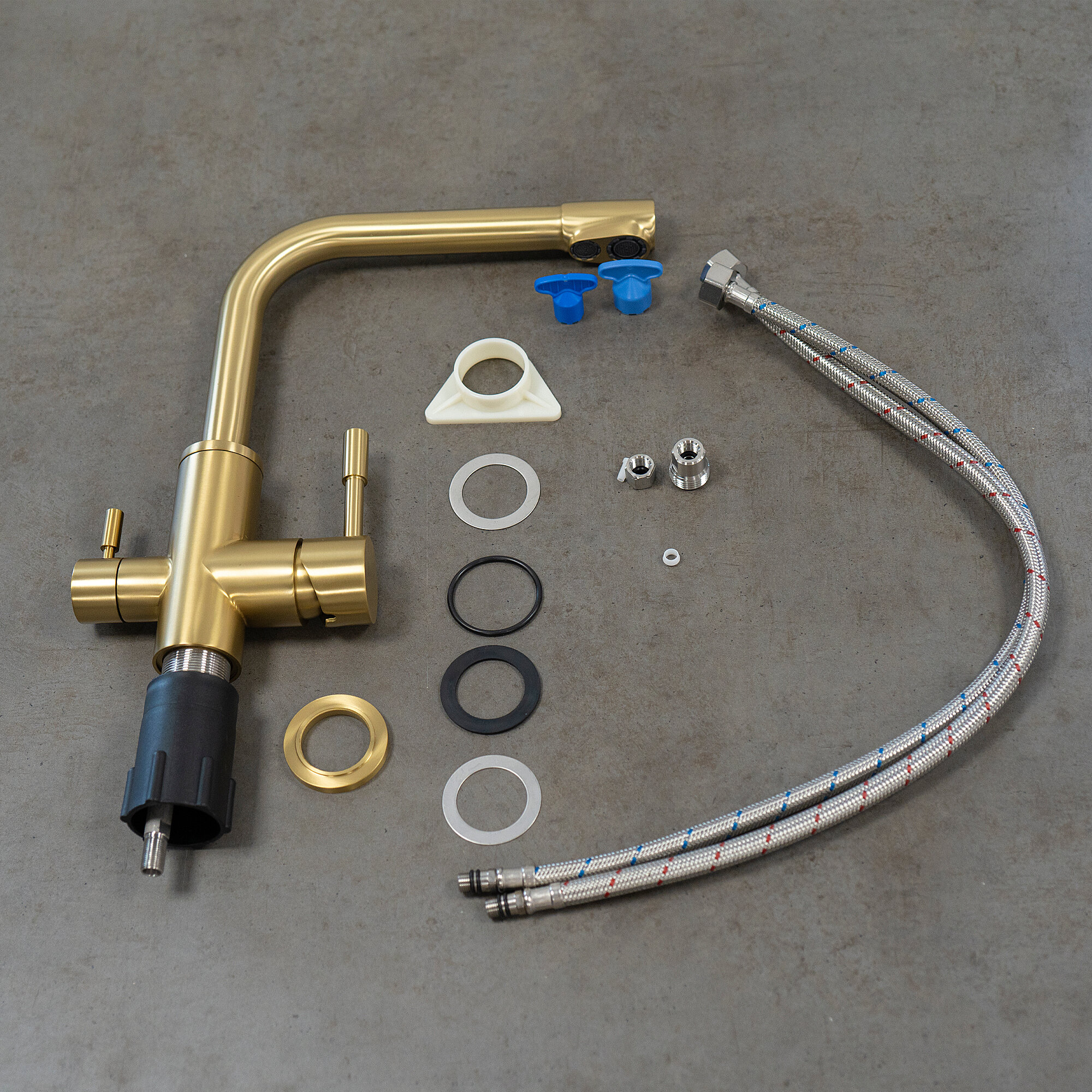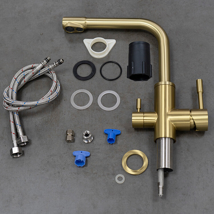 | Комплектация | тело смесителя с установленным картриджем, кранбуксой и металлическими рукоятками - 1 шт., излив с установленными аэраторами для водопроводной и питьевой воды - 1 шт., гибкая подводка 50 см - 2 шт., гайки 1/2 дюйма для подключения к водопроводной системе, набор переходников для подключения к фильтру питьевой воды, паспорт изделия -1 шт., гарантийный талон - 1 шт. |