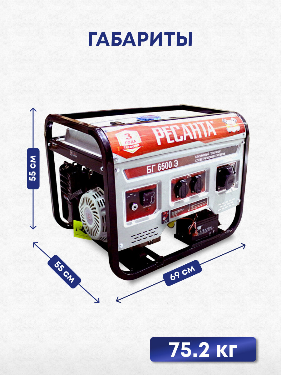 Бензиновый генератор Ресанта БГ 6500 Э, 220/12 В, 5.5кВт, с АКБ [64/1/46]