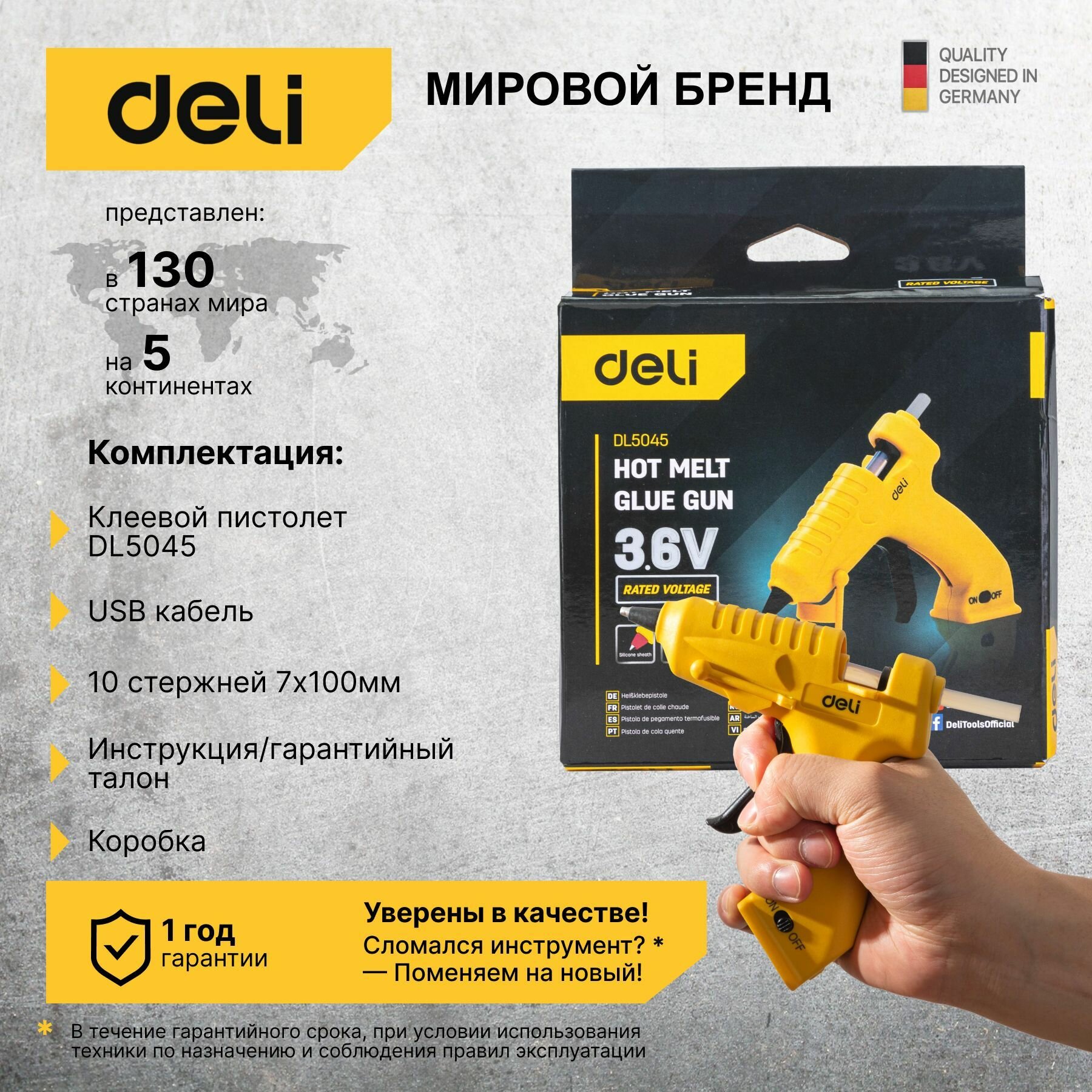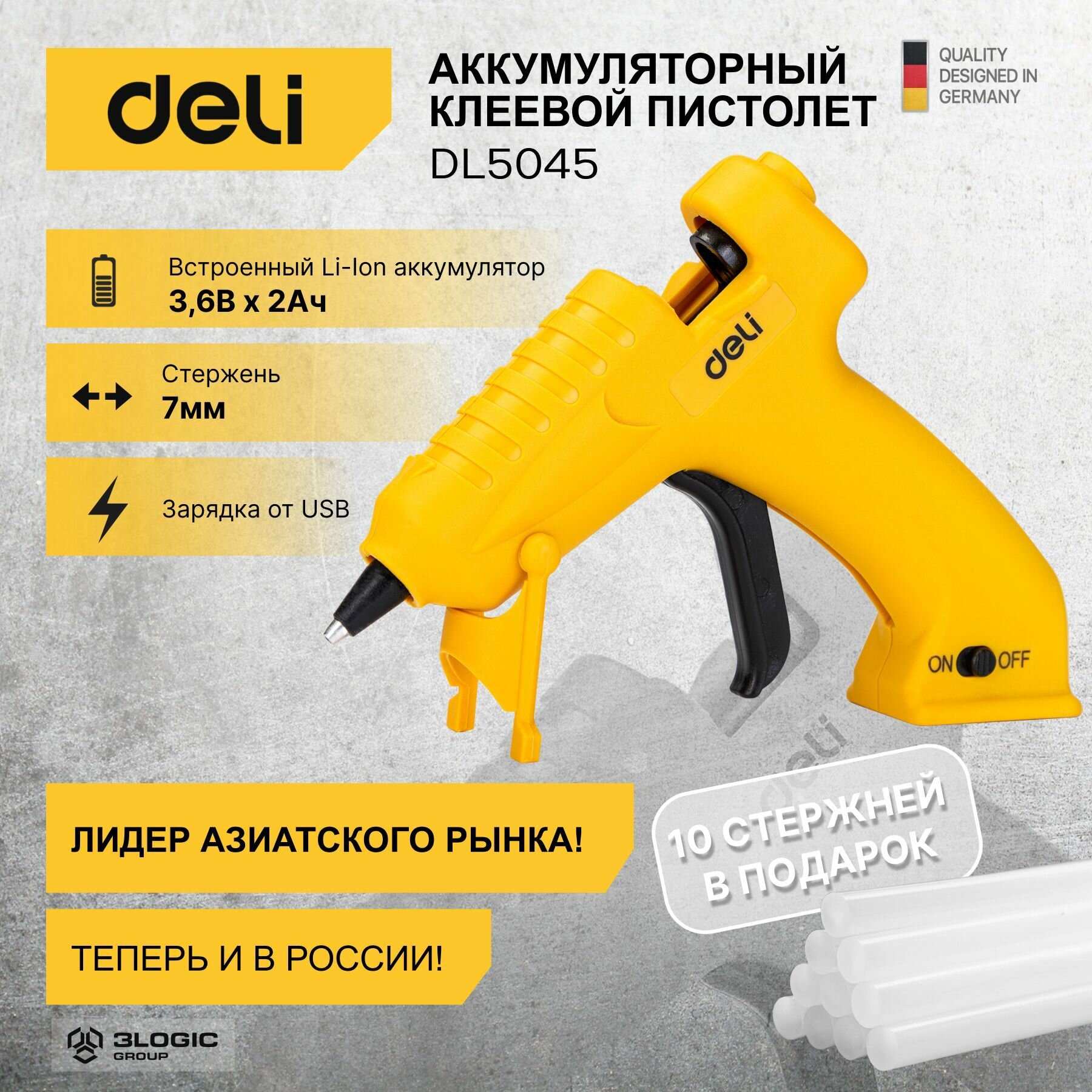 Аккумуляторный клеевой пистолет Deli DL5045 (3,6В, 2А*ч, диаметр стержня 7мм, в комплекте 10 стержней 7х100мм)