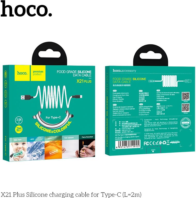 Силиконовый кабель USB - Type-C HOCO X21 Plus 2 метра 3.0А белый "Провод usb type-c 2 метра силиконовый"