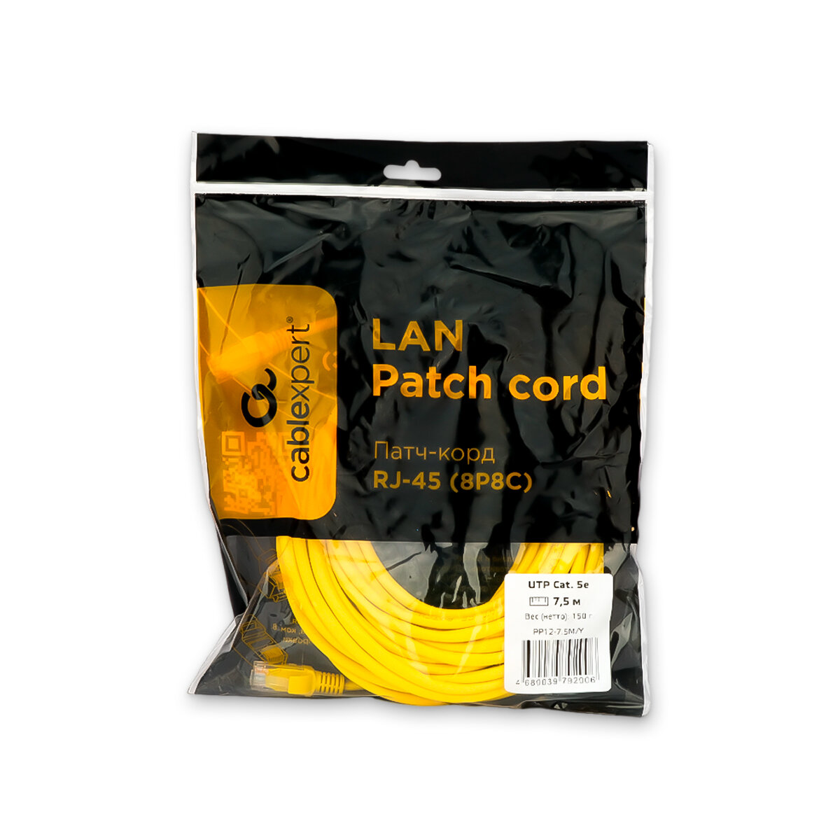 Патч-корд UTP Cablexpert PP12-7.5M/Y кат.5e, 7.5м, жёлтый