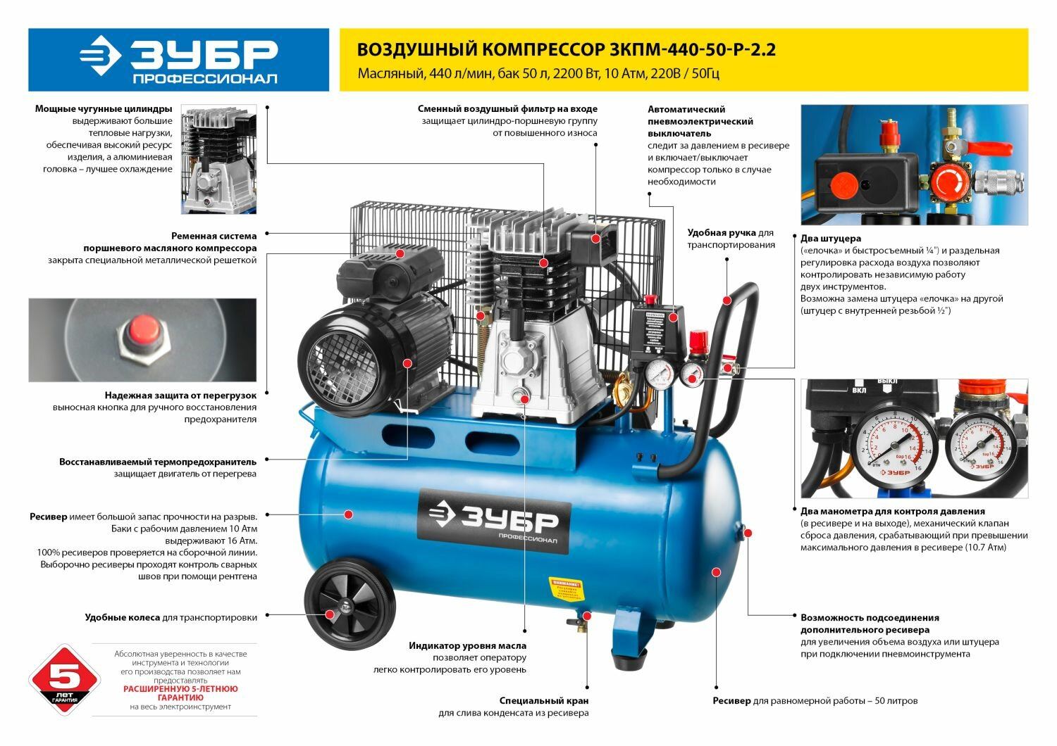 Компрессор воздушный масляный Зубр ЗКПМ-440-50-Р-2.2, 440 л/мин, 50 л, 10 Атм, 2200 Вт, 220 В