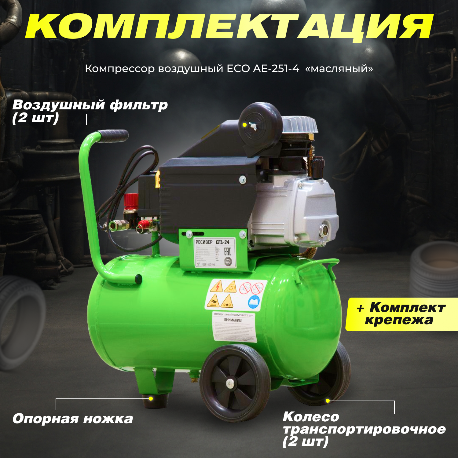 Компрессор ECO AE-251-4 (260 л/мин, 8 атм, коаксиальный, масляный, ресив. 24 л, 220 В, 1.80 кВт) (AE-251-4)