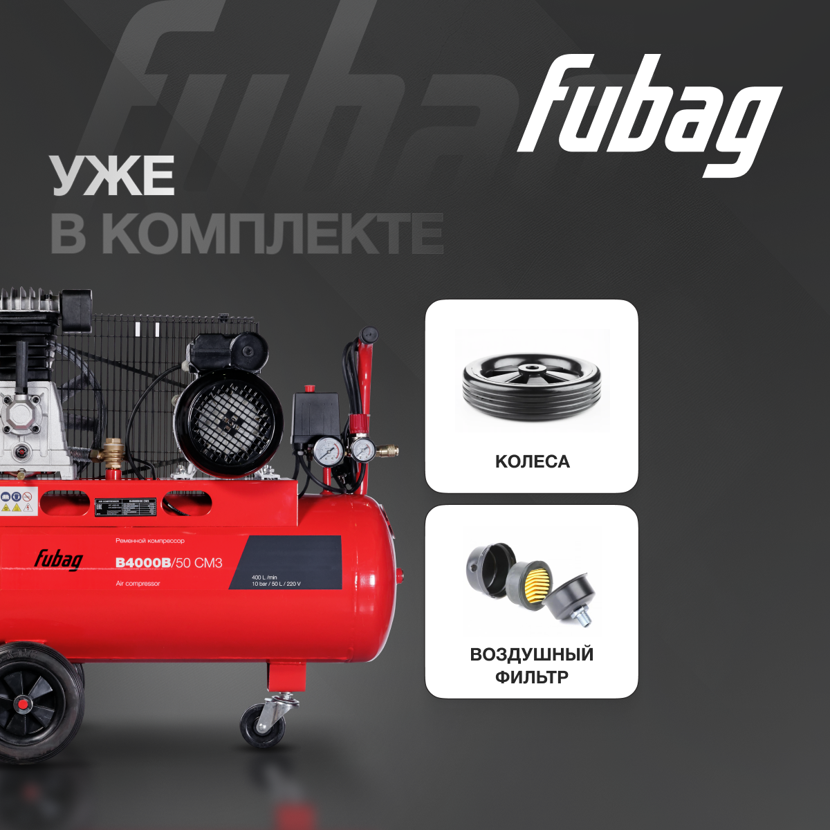 СохранитьКомпрессор воздушный ременной FUBAG B4000B/50, 400 л/мин, ресивер 50 л, 10 бар, 220 В интересное: