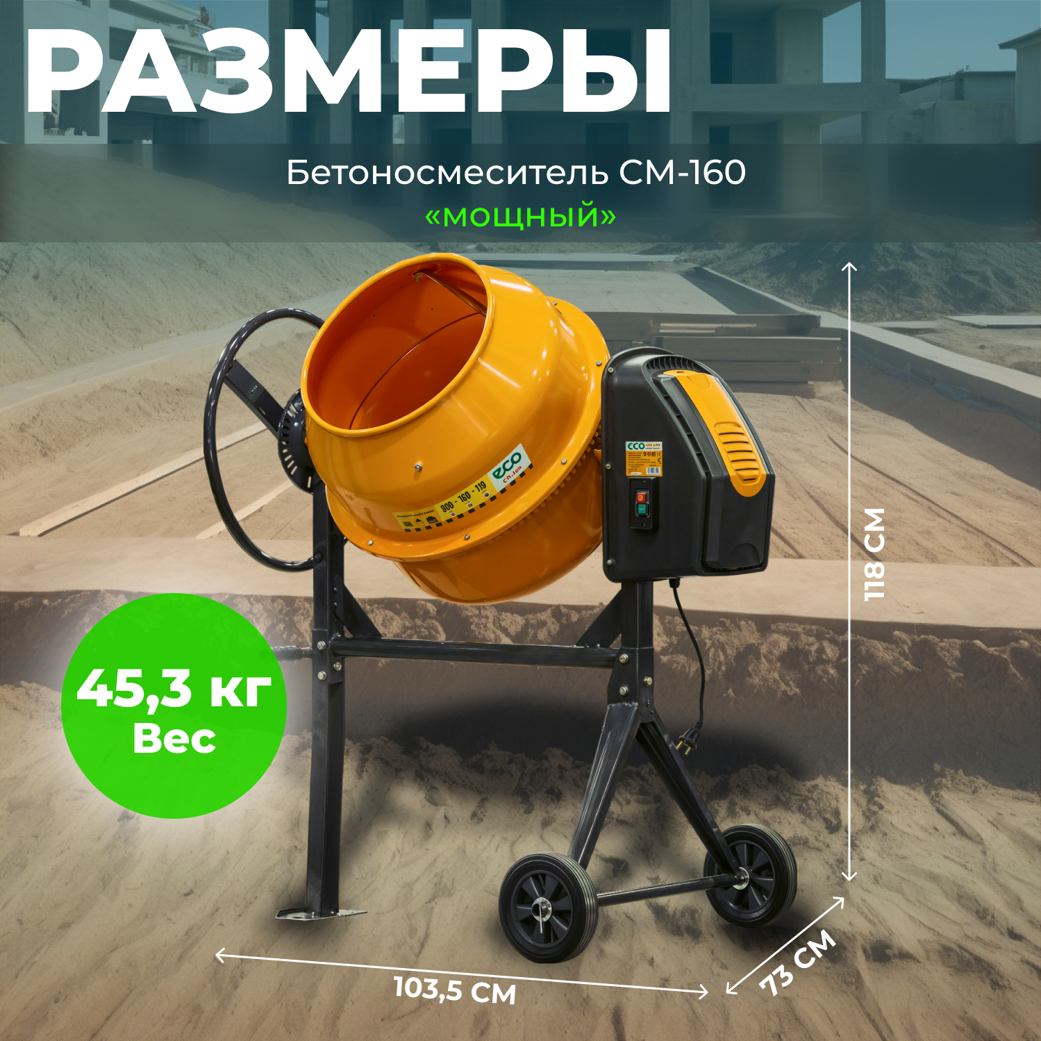 Бетономешалка электрическая ECO CM-160 (объём 160/119 л, 800 Вт, 230 В, вес 48 кг) (EC3410-5)
